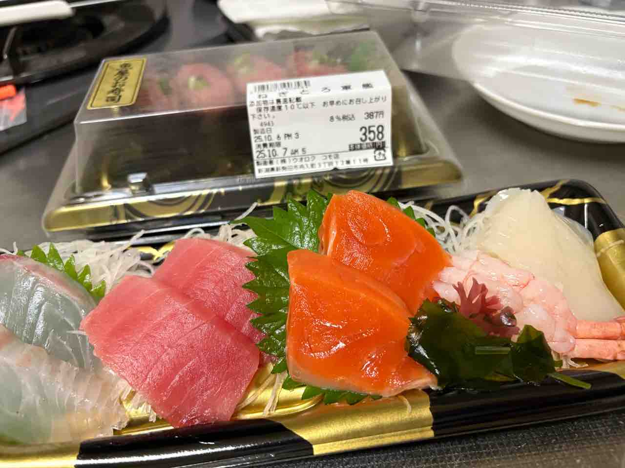 晩ご飯は刺身盛り合わせにイカの寿司。