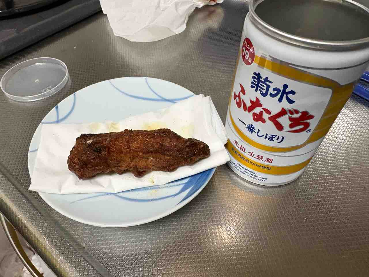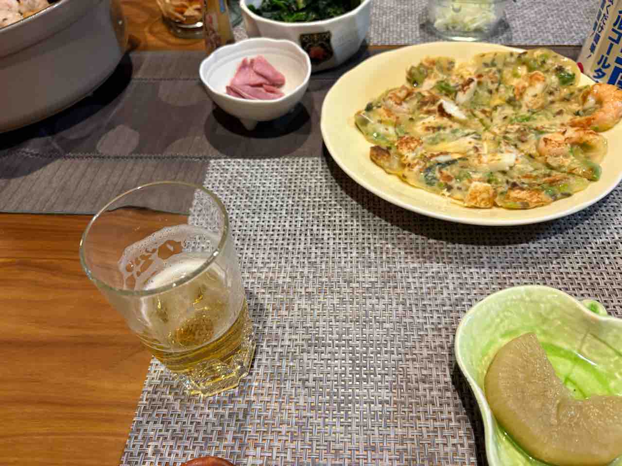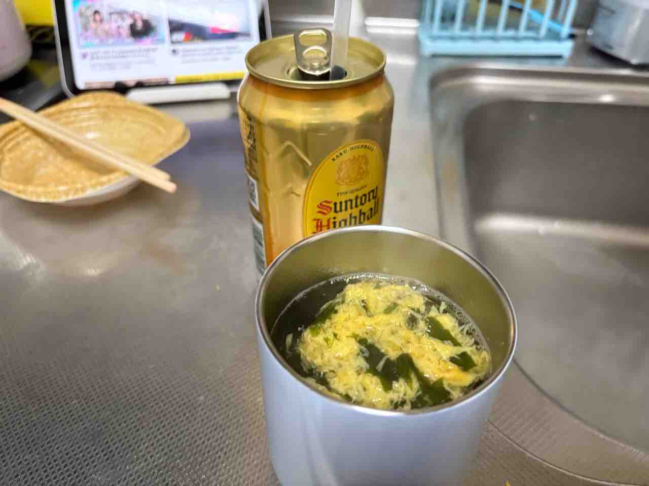 朝食はお決まりのカップ麺に刻みネギ追加の群馬から持ってきたチヂミの残り。