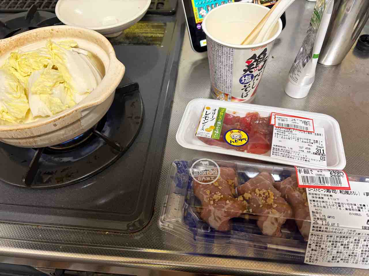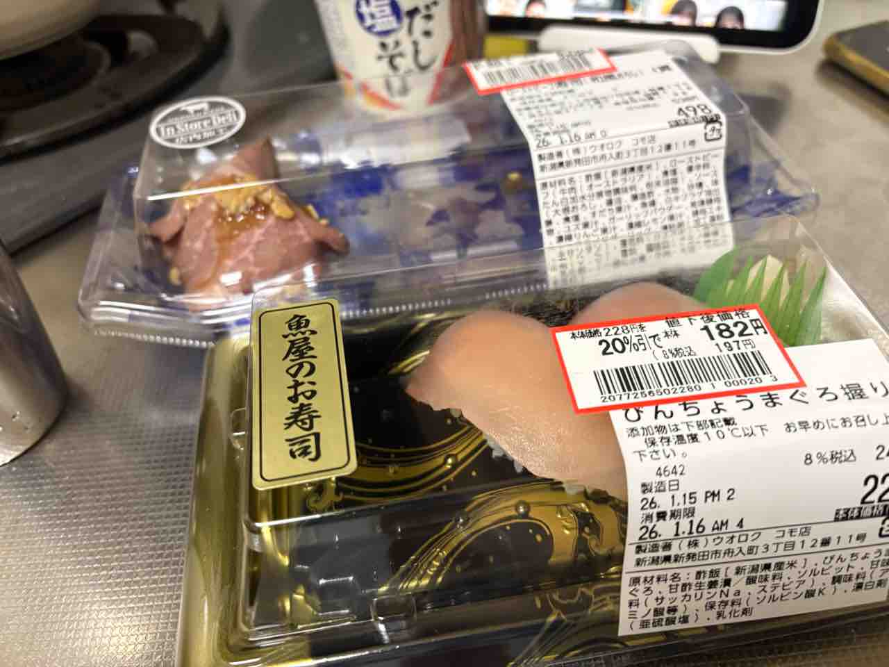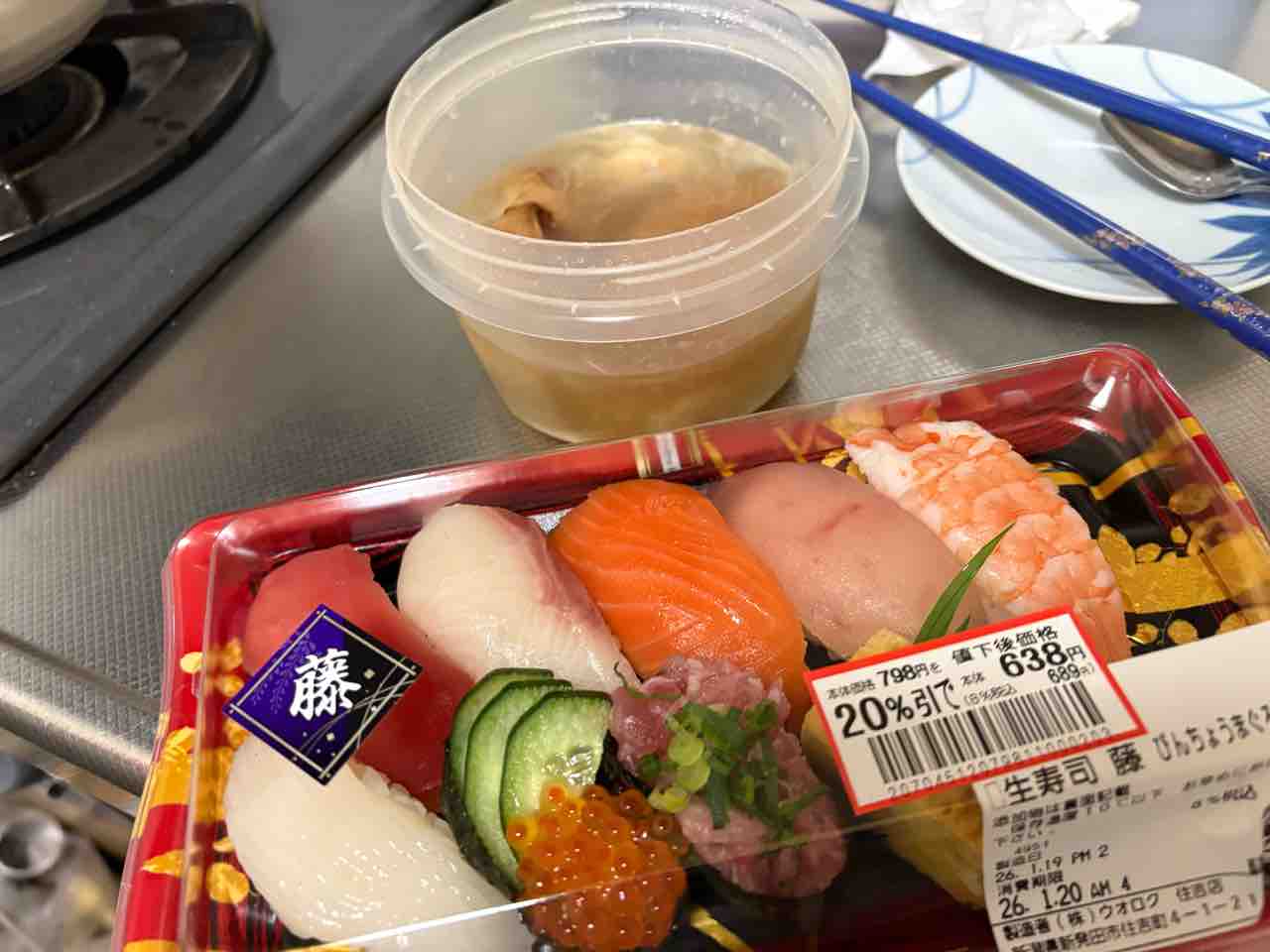 晩ご飯は割引寿司に群馬から持ってきたおでん。