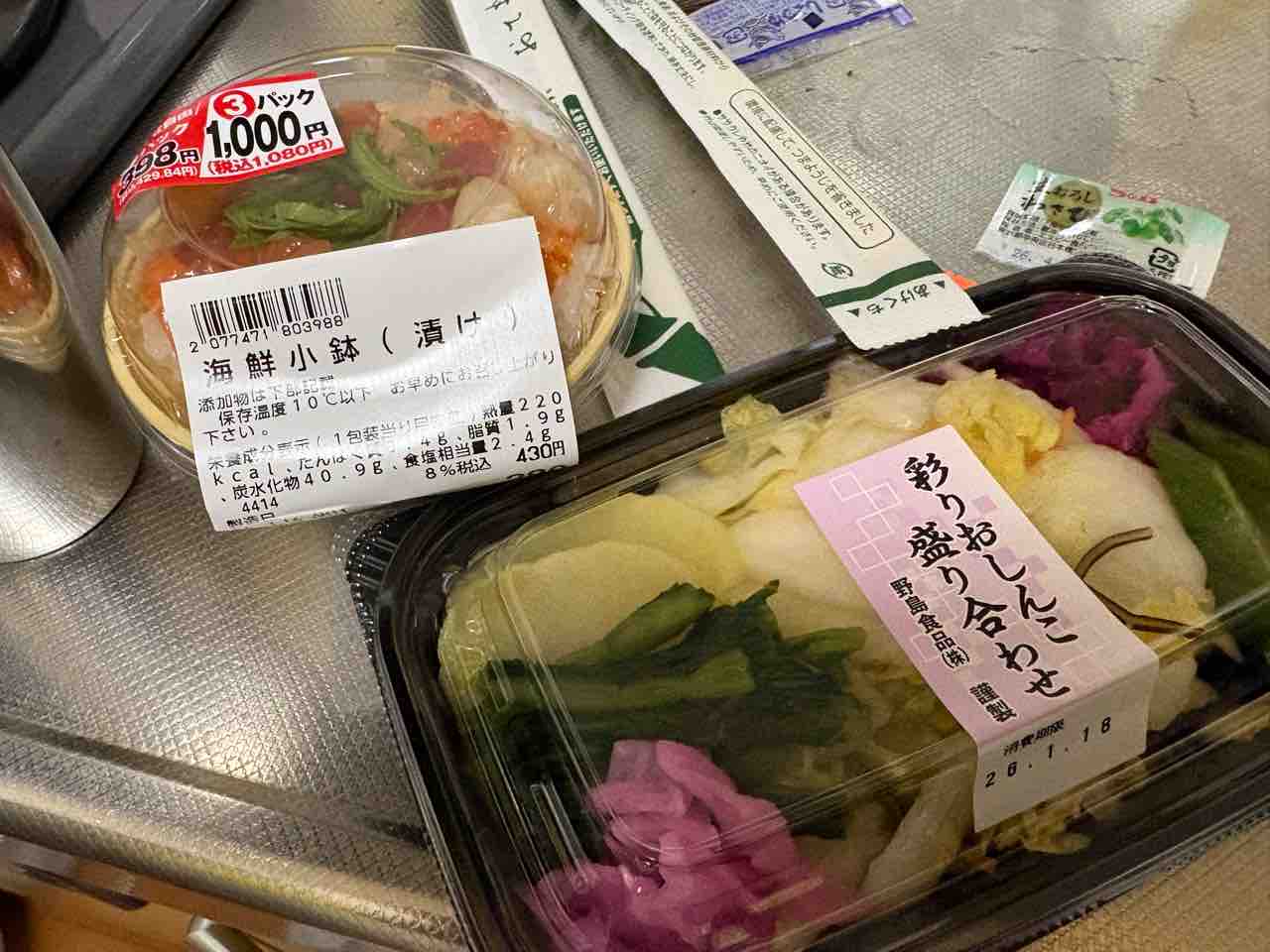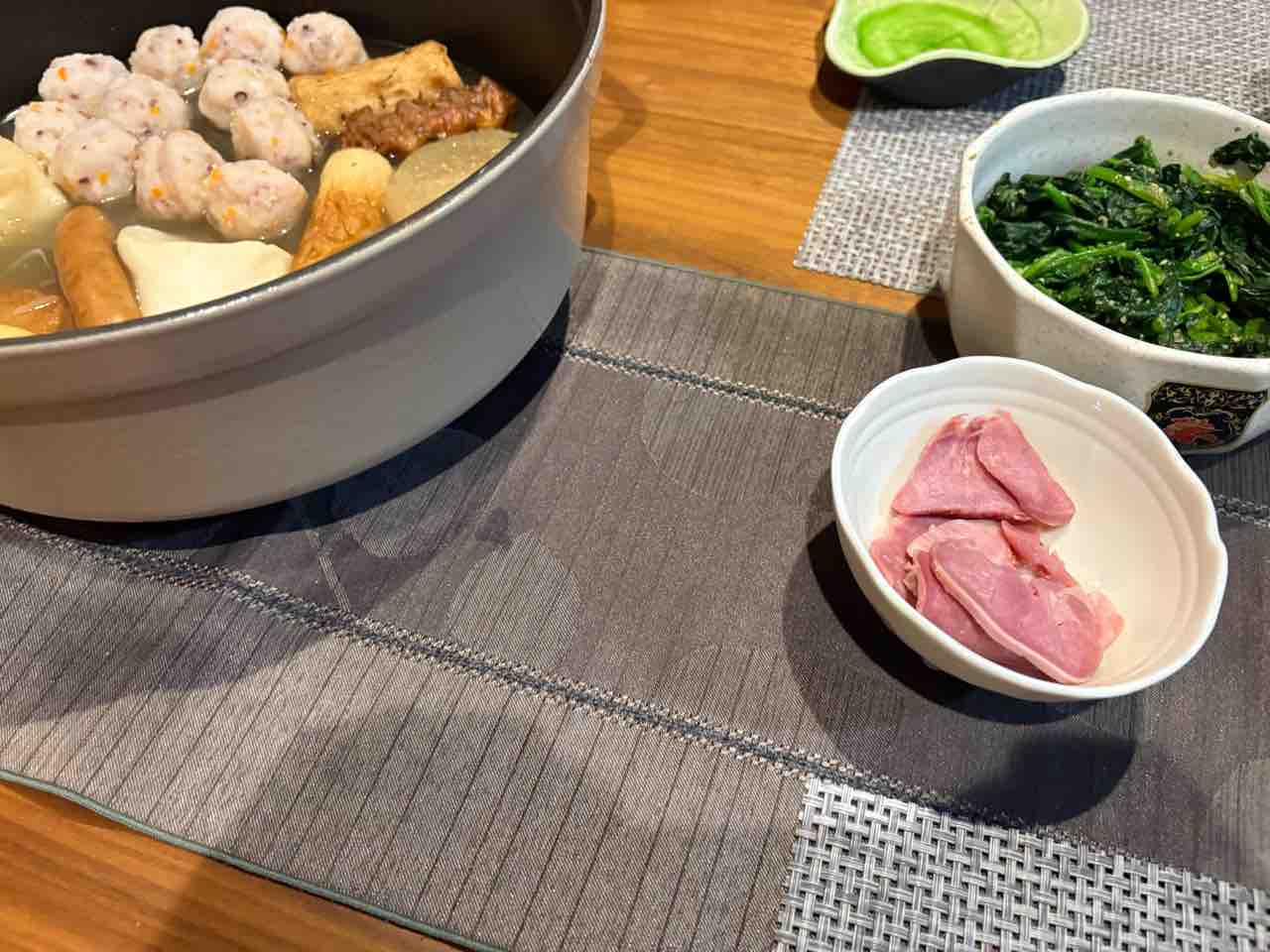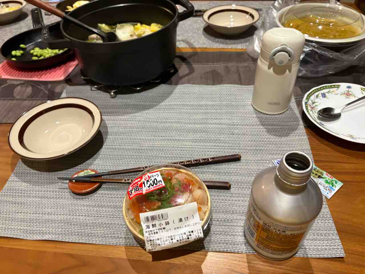 晩ご飯は割引寿司に群馬から持ってきたおでん。