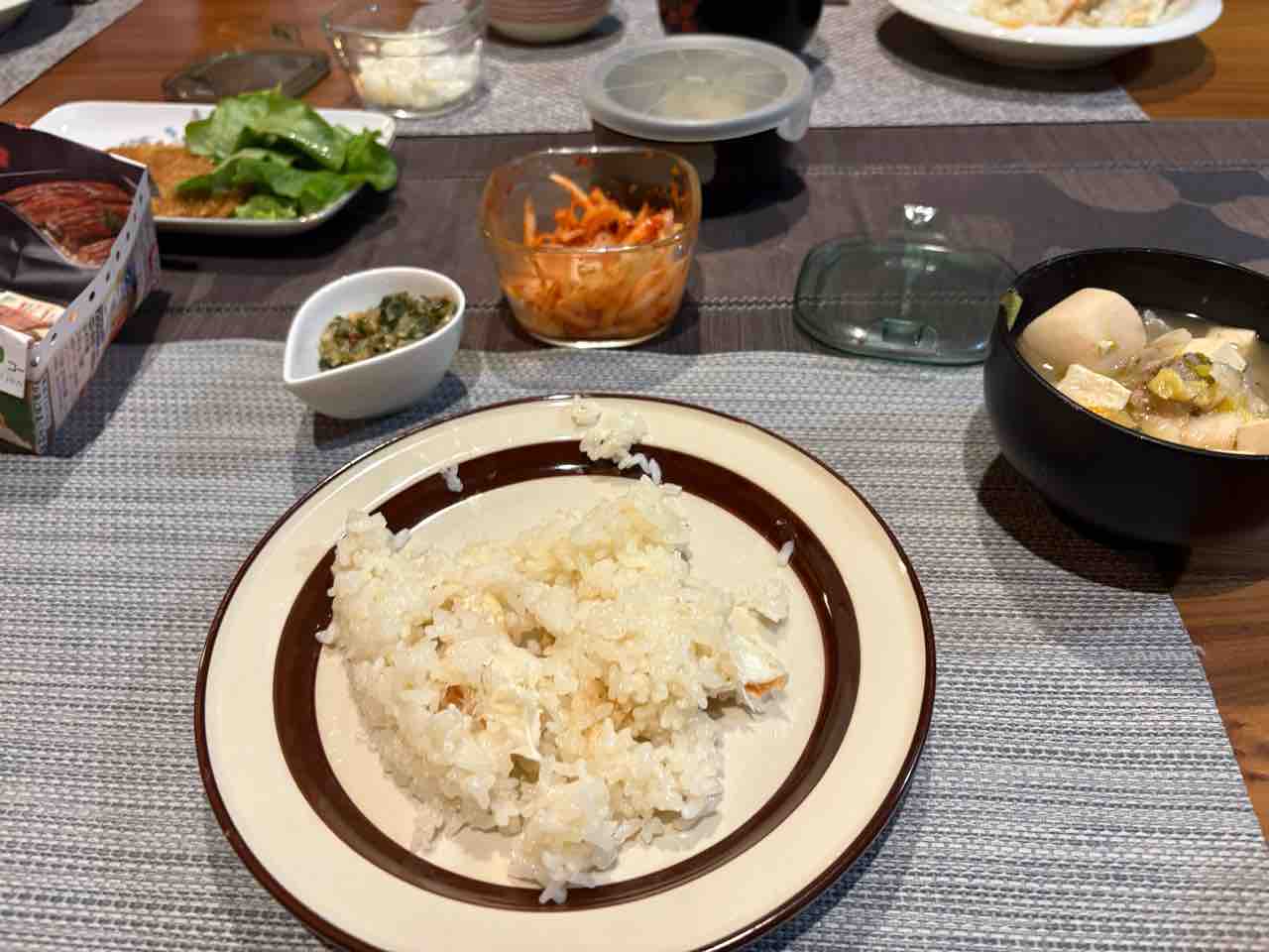 昼ご飯はレンチン自家製紫蘇ふりかけご飯に漬物と、