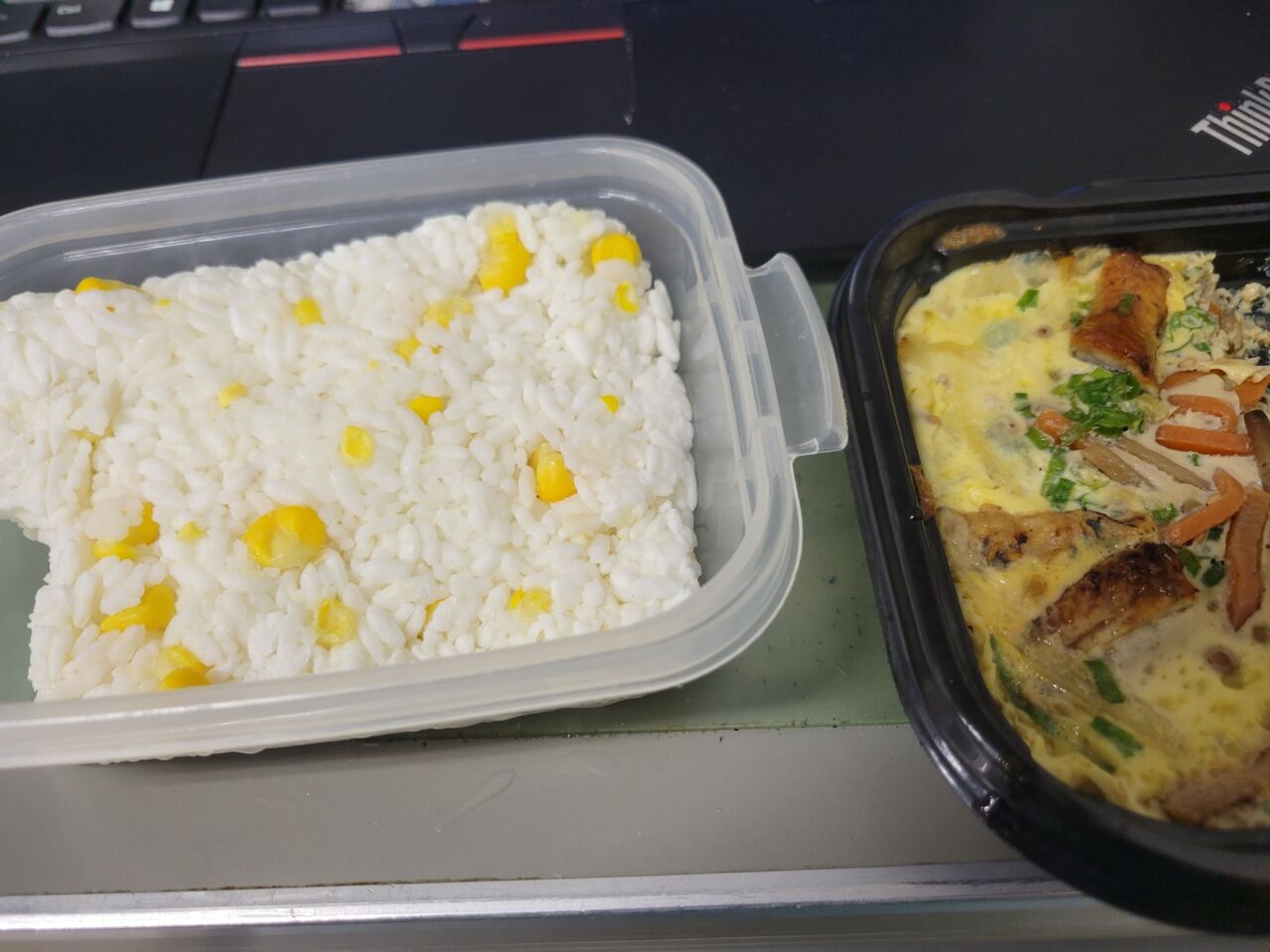 昼ごはんはレンチンふりかけとうもろこしご飯にうなぎ柳川の残り。