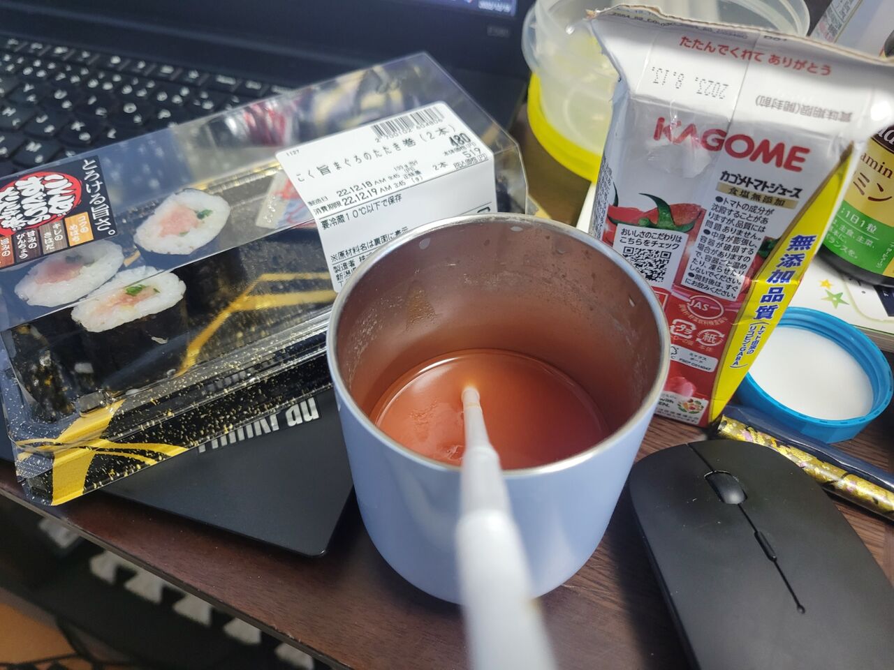 朝食は昨日の残りのねぎとろ巻とトマトジュース。
