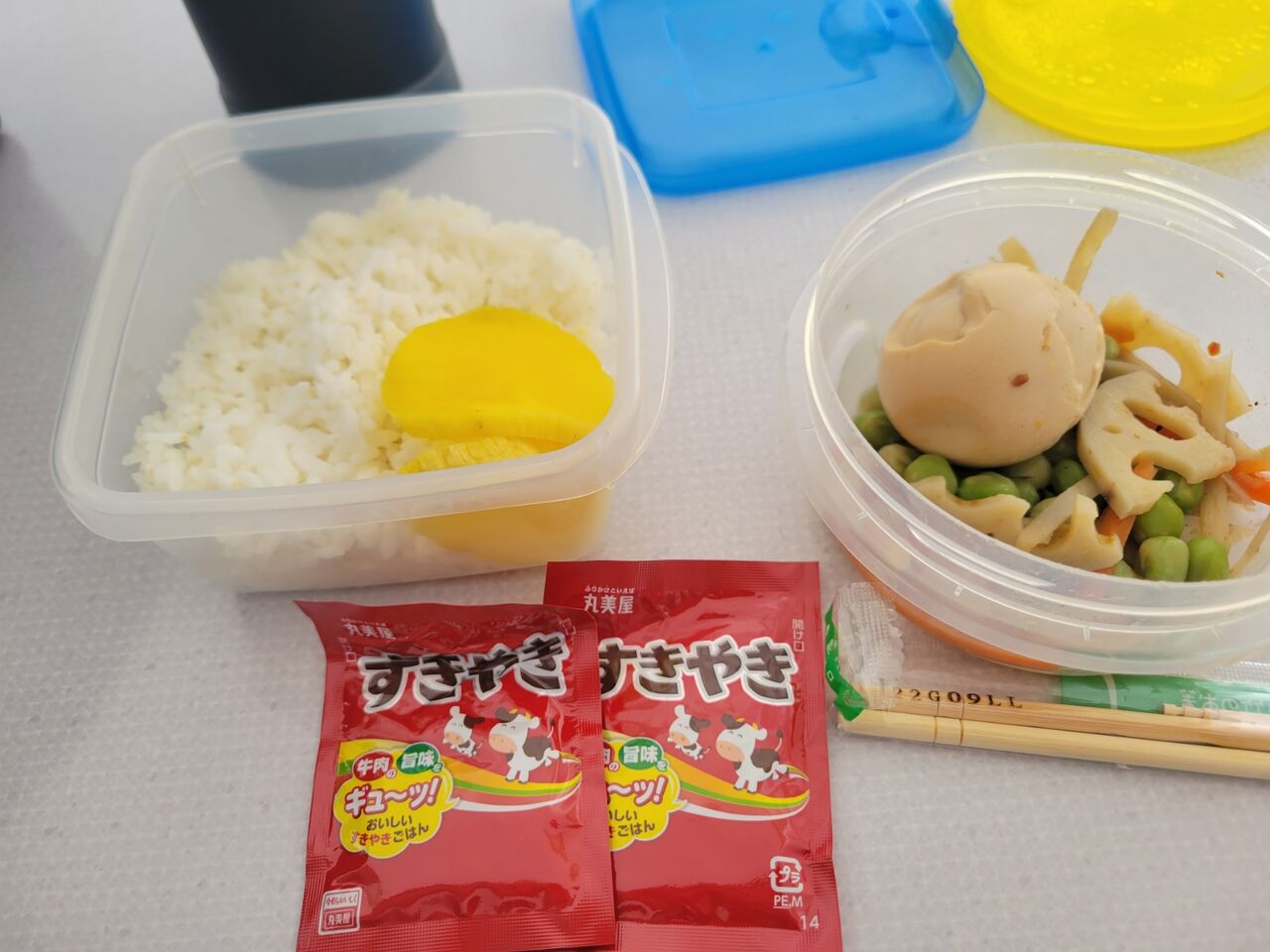 群馬から持ってきたきんぴらごぼうに味玉としお豆。