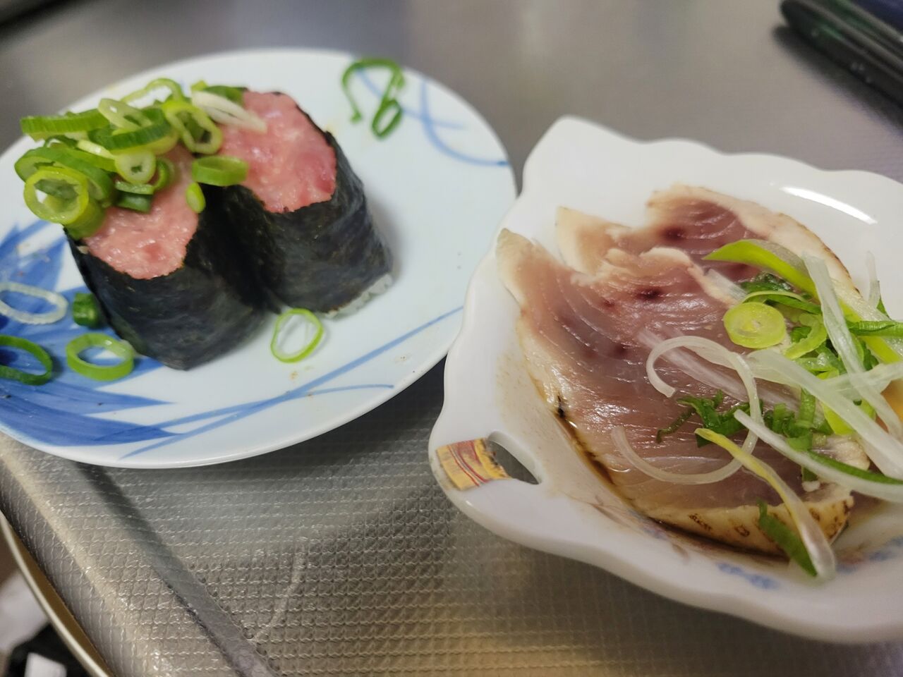 シャワー浴びて二度目の朝食は昨晩の残りの炙りビンチョウマグロにネギトロ軍艦