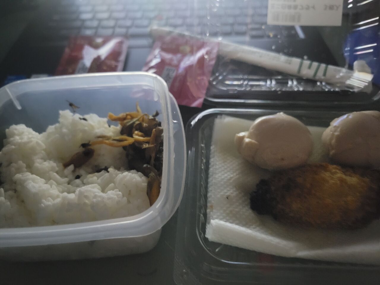 昼ごはんはふりかけご飯に漬物と味玉2個白身魚フライ