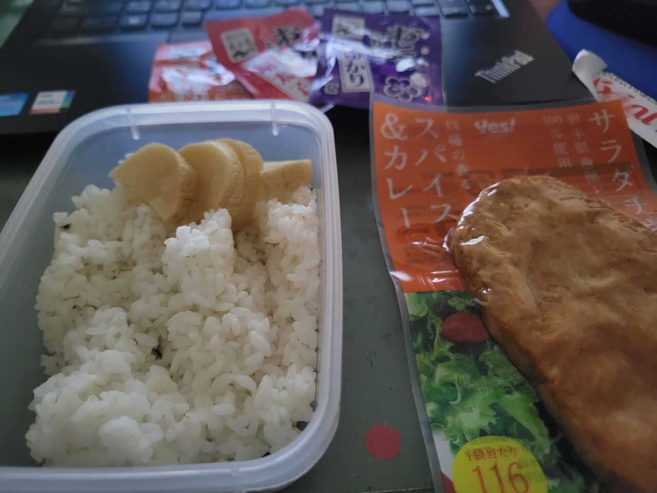 昼ごはんはふりかけご飯にたくあんとサラダチキン