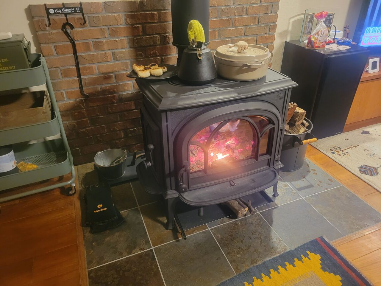 夜は久しぶりに冷えるので薪ストーブ着火ついでに調理。