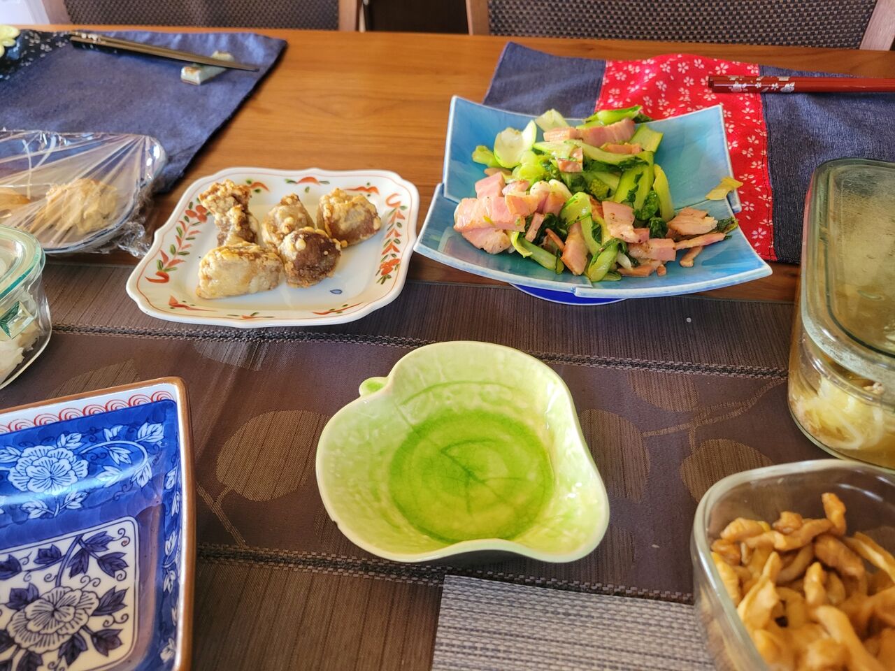 昼ごはんは野菜のベーコン炒めに新潟で買ってきたマグロ唐揚げ