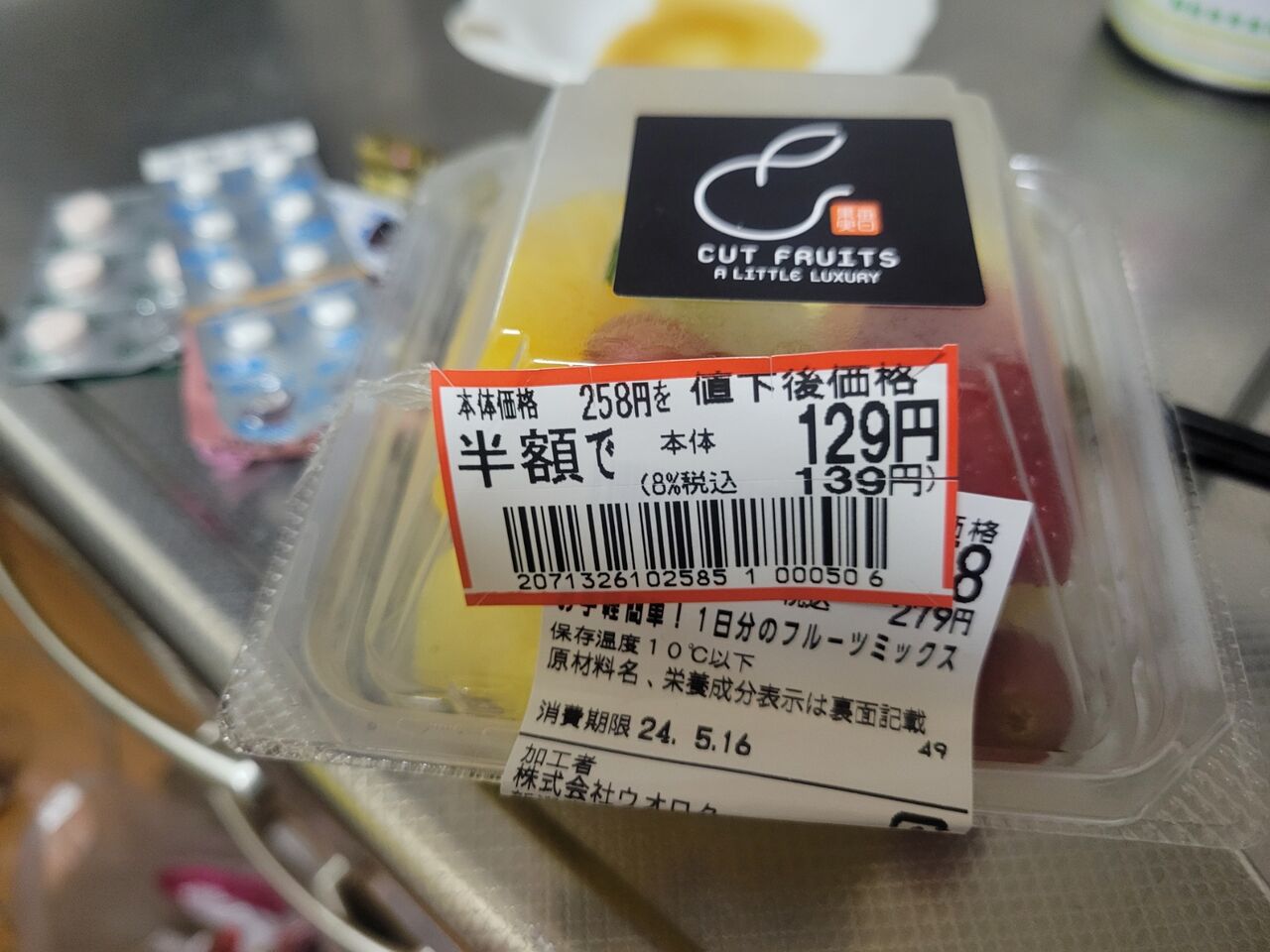 カットフルーツ食べて、薬飲んで。