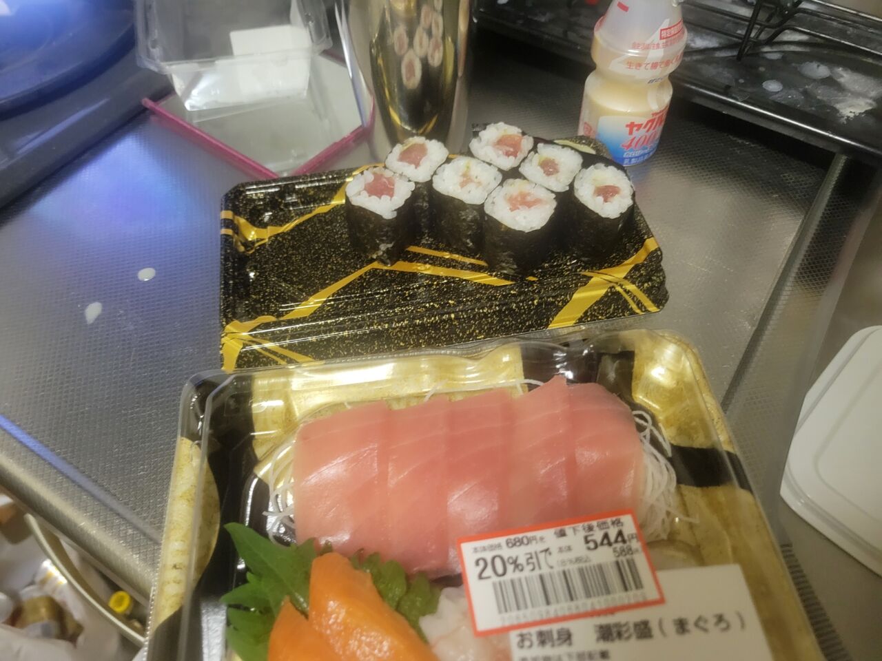 晩御飯は鉄火巻の残りに割引刺身盛り合わせ