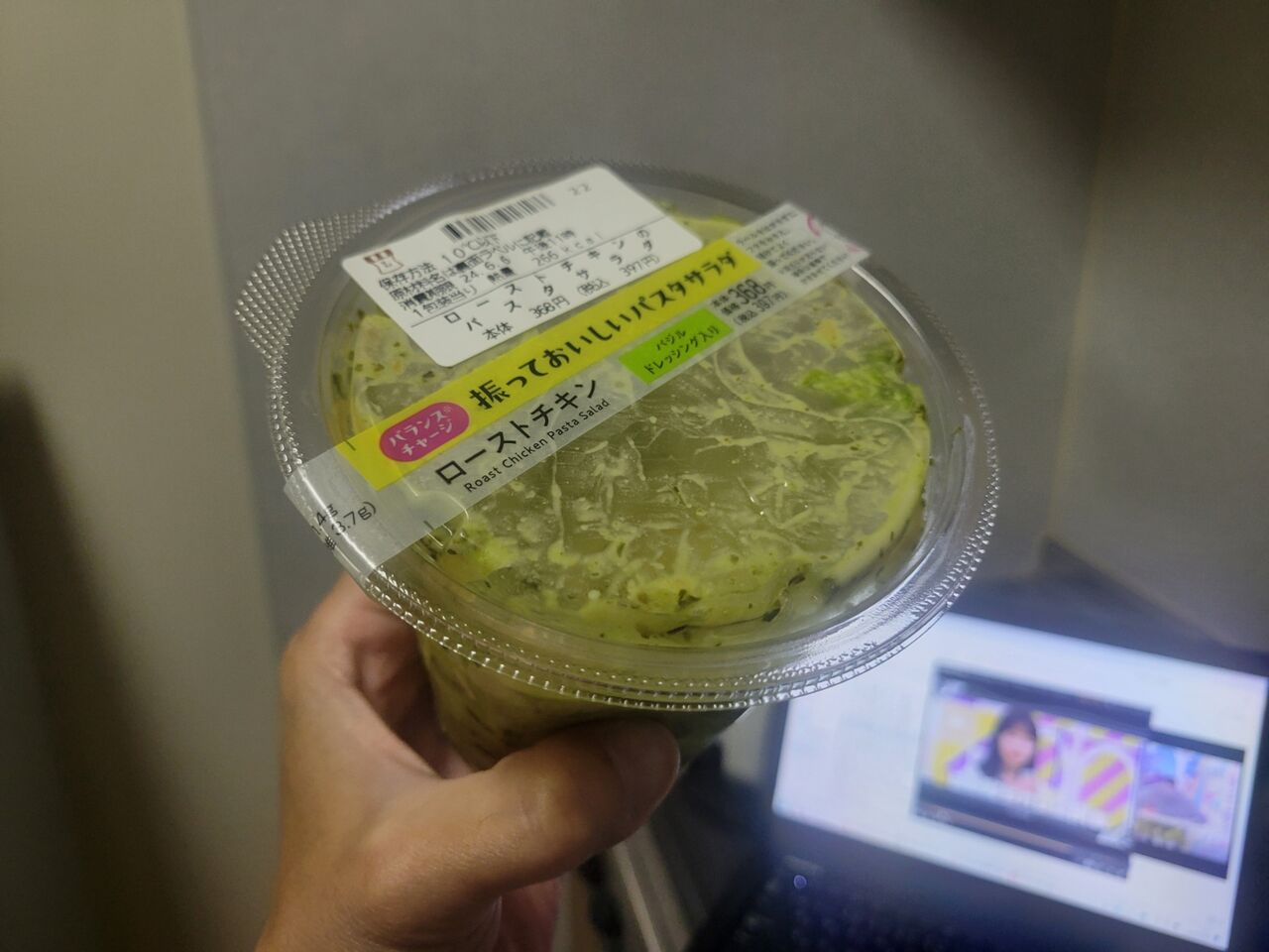朝食はカップ麺ではなく振って混ぜるパスタ。266kcal。