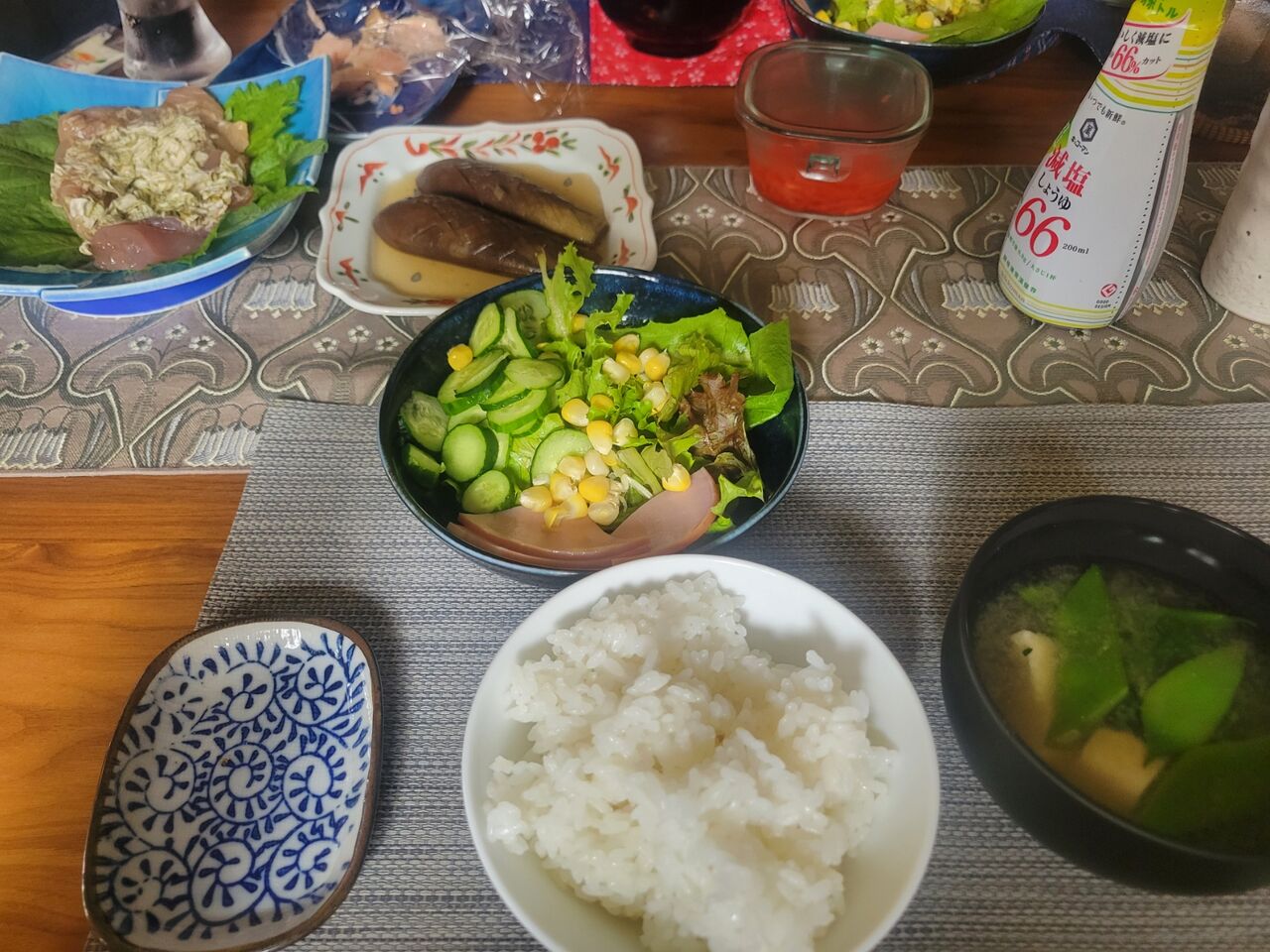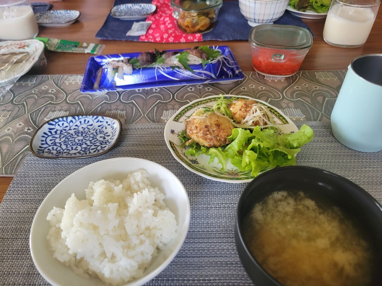 新潟で買ってきたマグロの昆布〆や庭で取れた茄子の煮浸しとか。