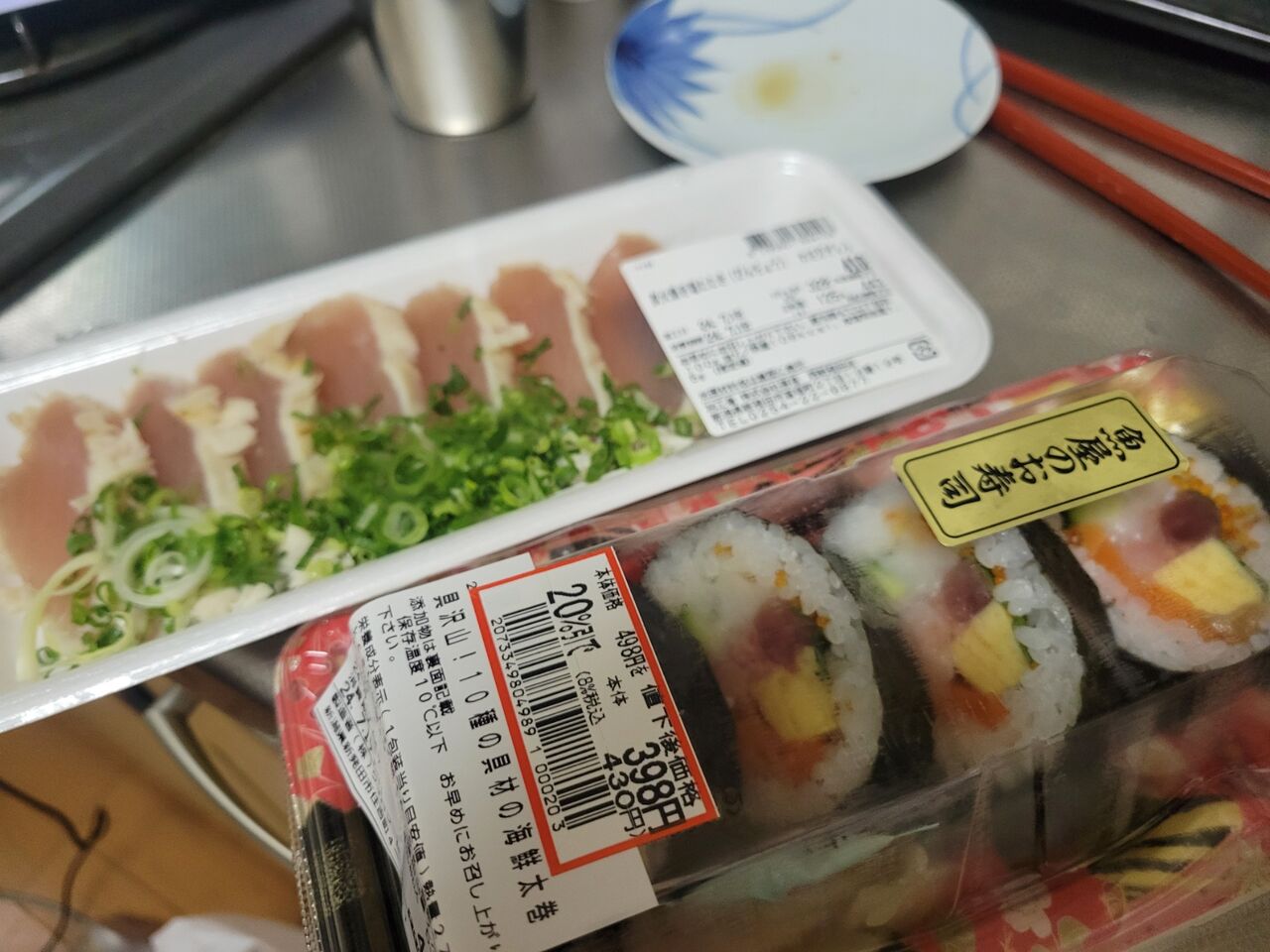 シャワー浴びて二度目?三度目の朝ご飯は寿司の残りにチャーシュー。