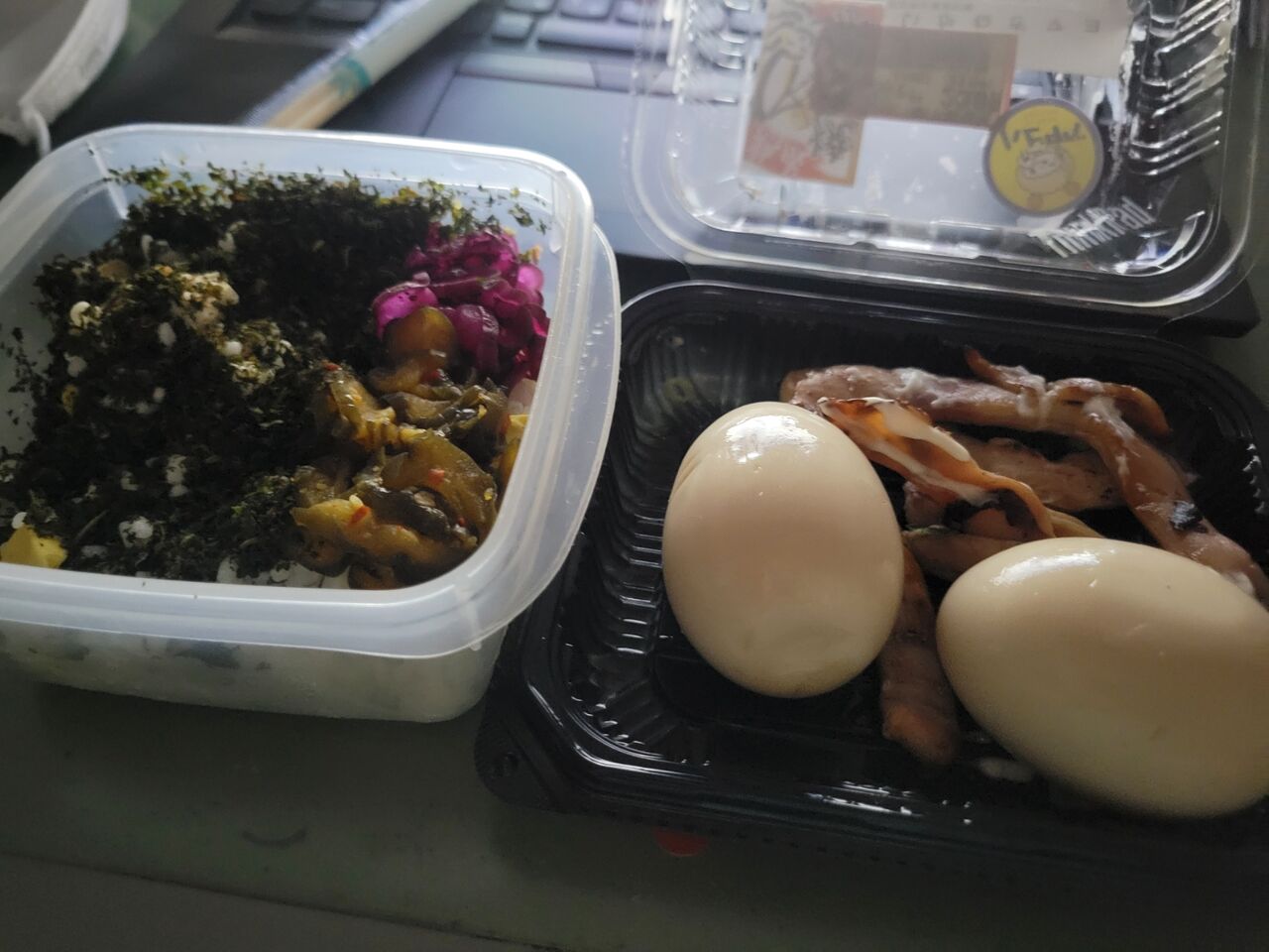 昼ご飯は自家製しそふりかけご飯に漬物とイカ焼きに味玉2個