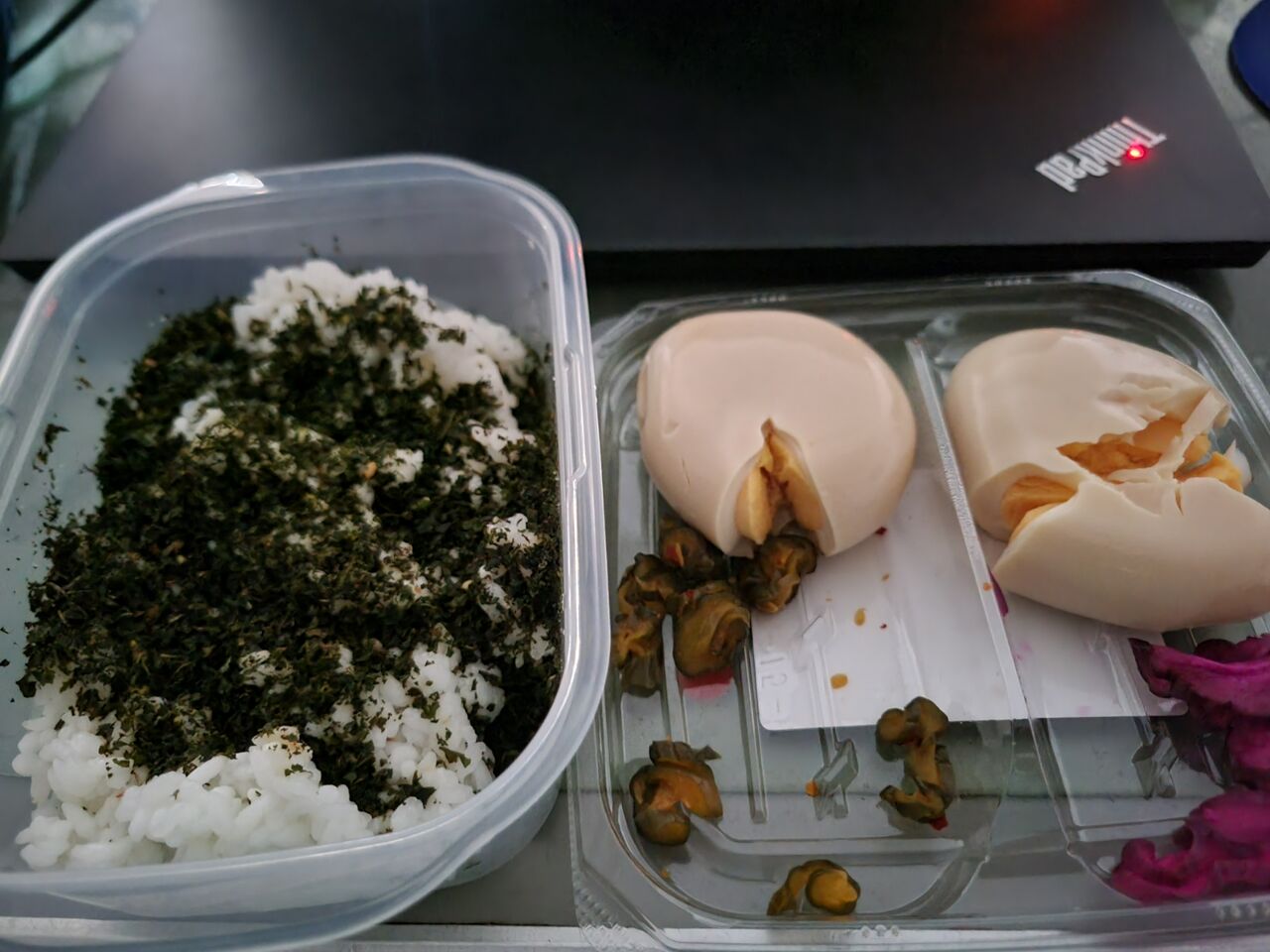 昼ご飯は自家製しそふりかけご飯に漬物と味玉2個