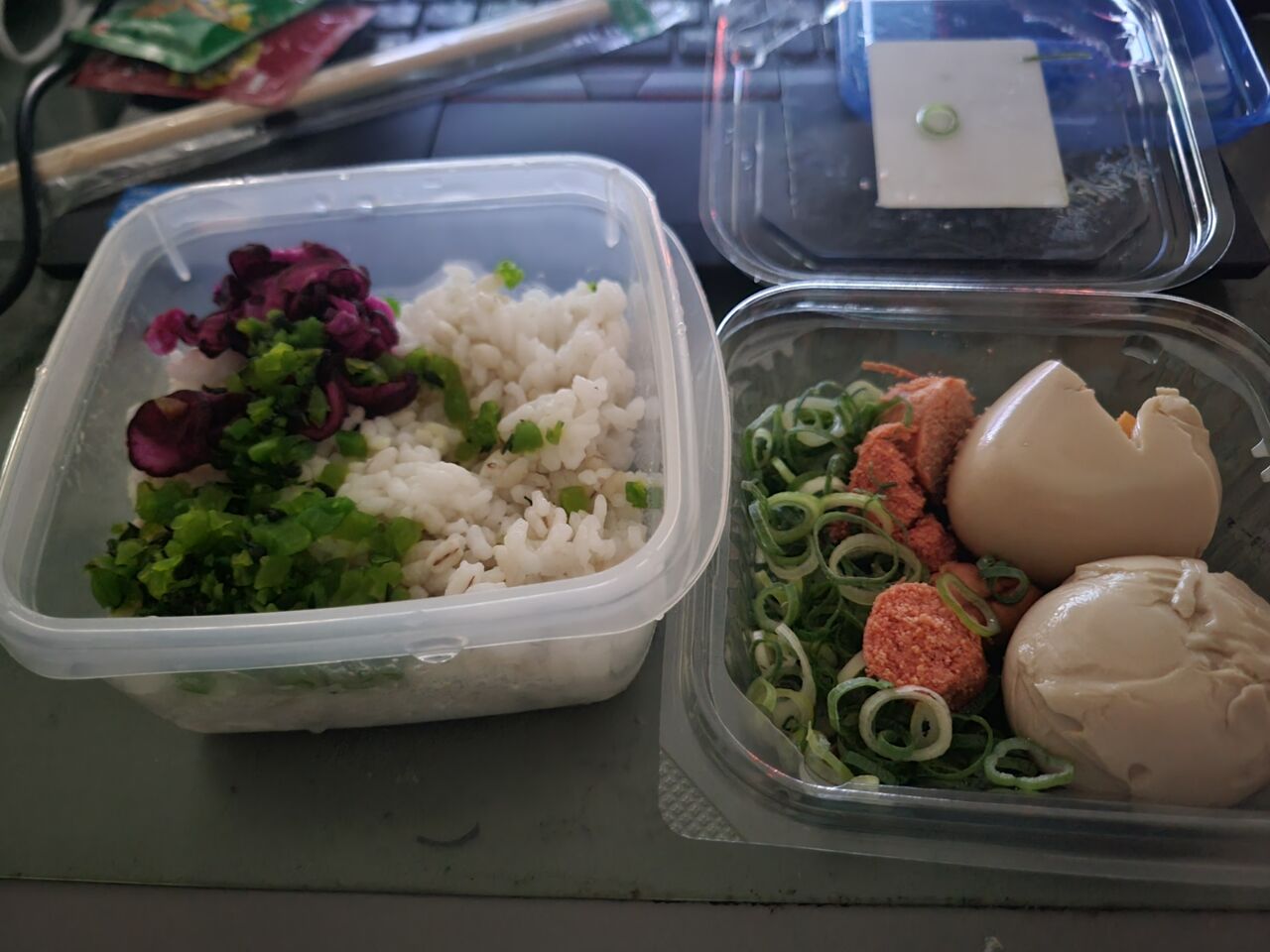 昼ご飯はふりかけご飯に漬物と味玉2個に焼き明太子