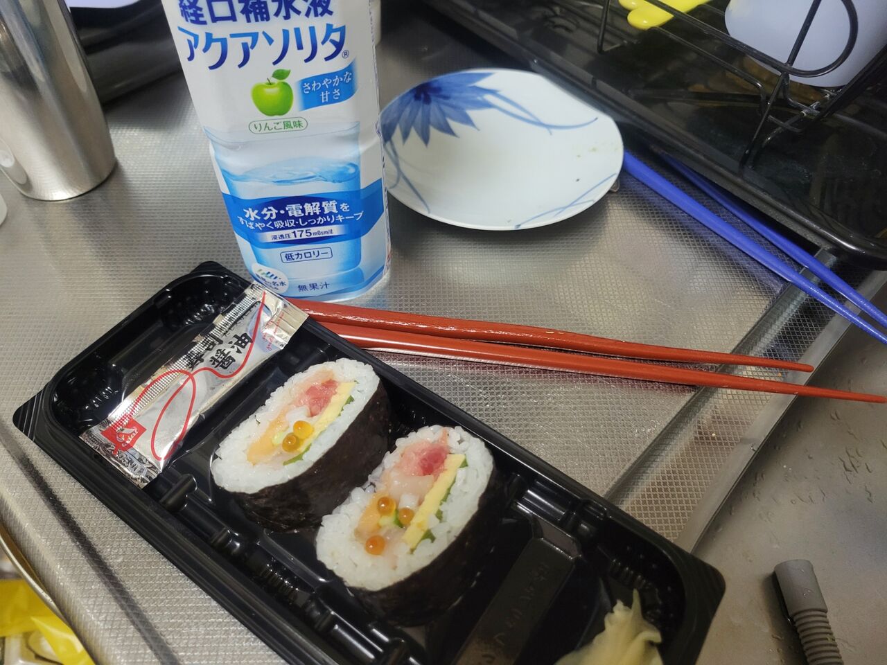 シャワー浴びて二度目の朝ご飯は太巻きずしの残り。