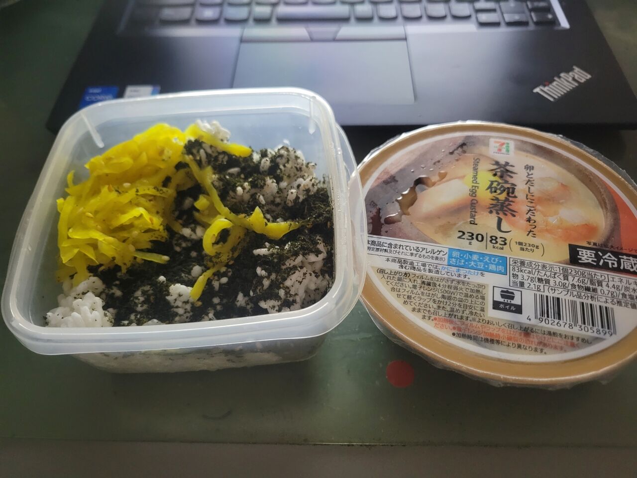 昼ご飯は自家製ふりかけご飯に刻みごまたくあんと
