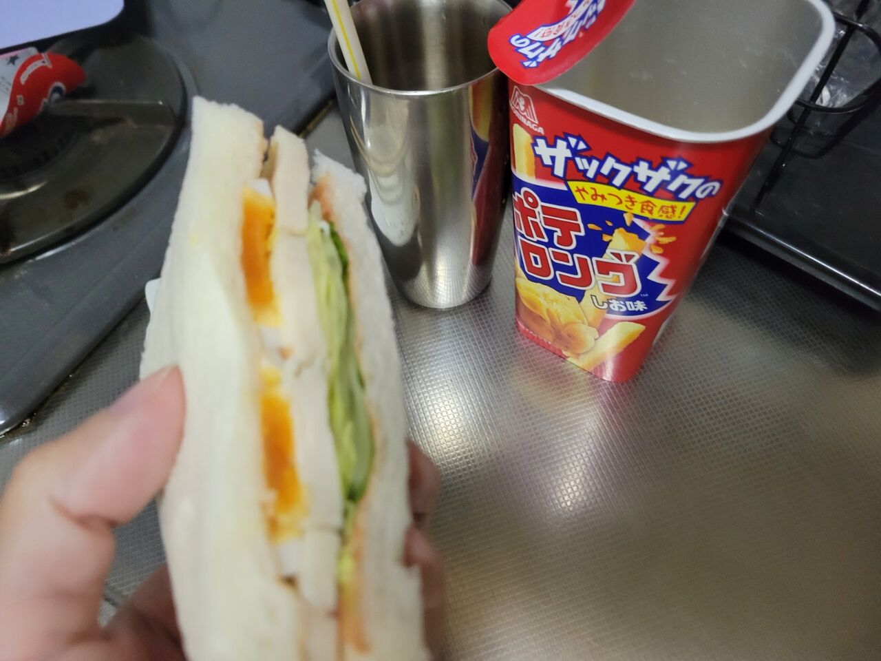 晩御飯は朝の残りのサンドイッチにかっきー。