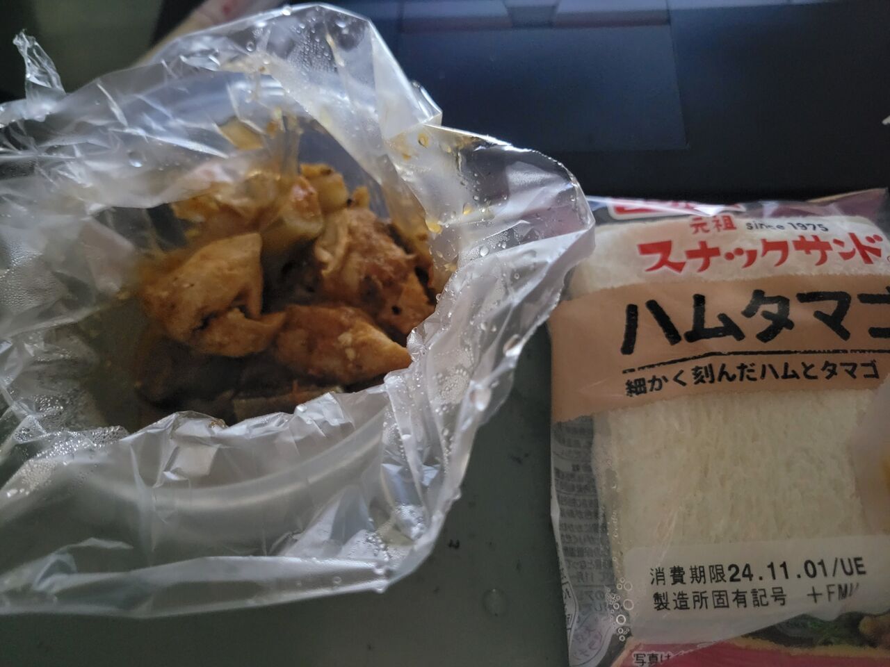 昼ご飯は冷凍してあった鶏と茄子のトマトソース煮にランチパックハムタマゴ