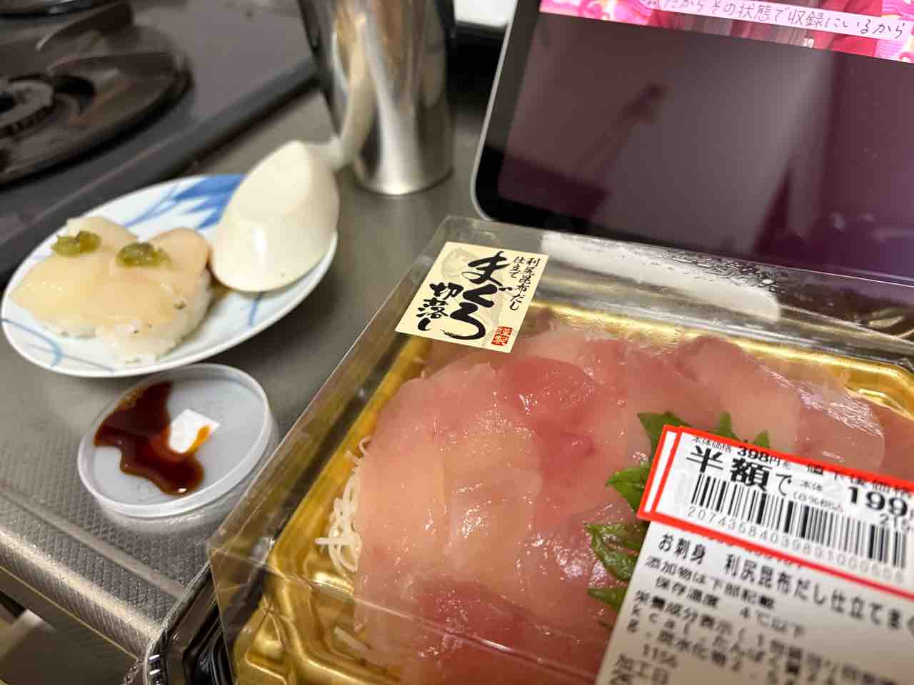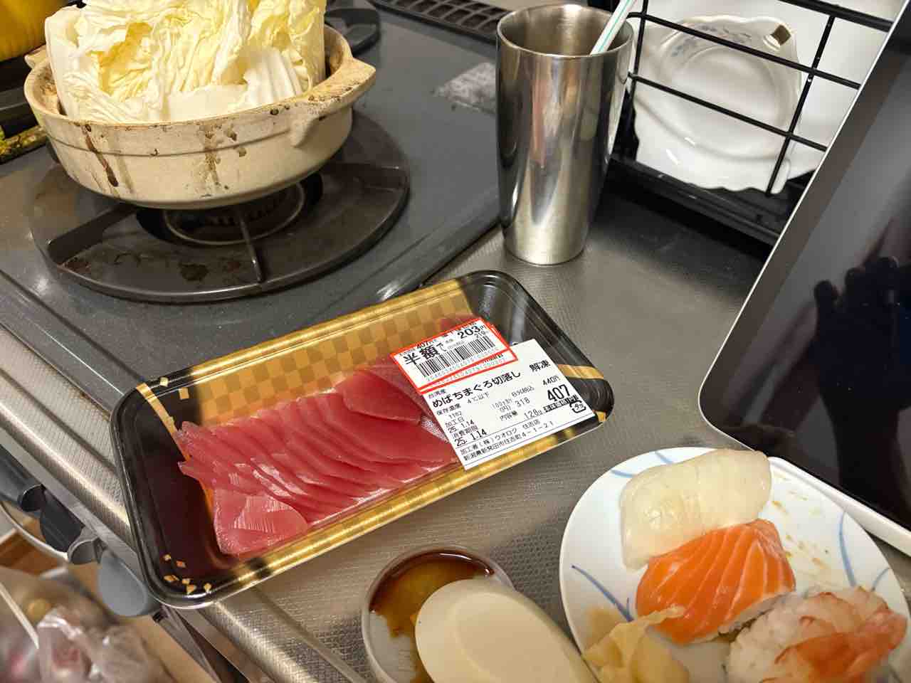 晩御飯は寿司の残りと刺し身の残りにカップ麺残りスープ白菜鍋。
