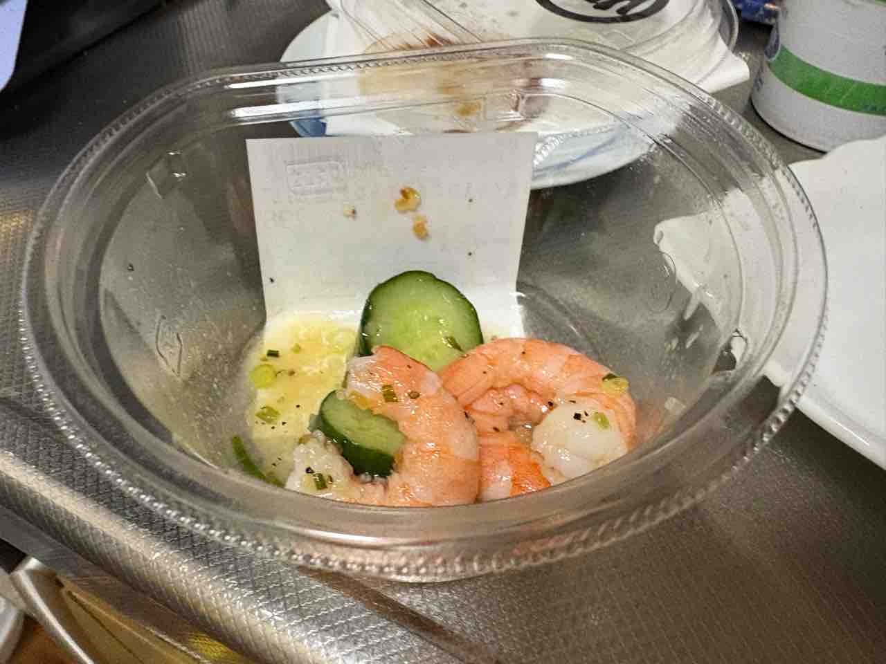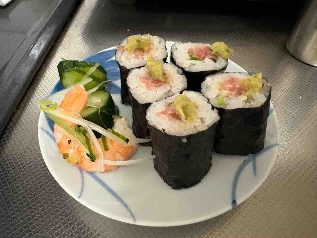晩御飯はネギトロ巻きとかエビときゅうりの和え物。