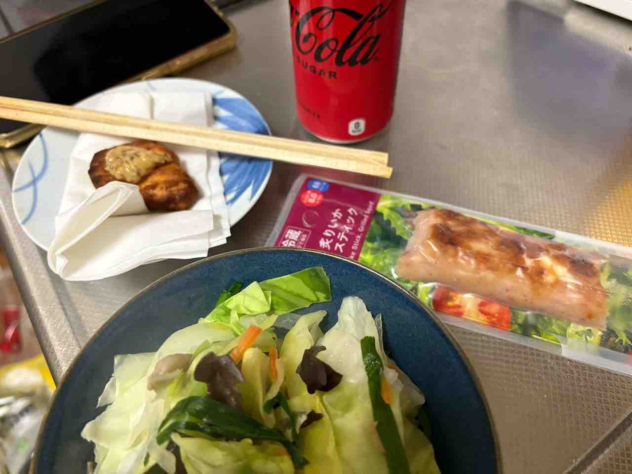 シャワー浴びて二度目の朝食は炙りイカかまぼこにレンチンカット野菜とナゲット1個