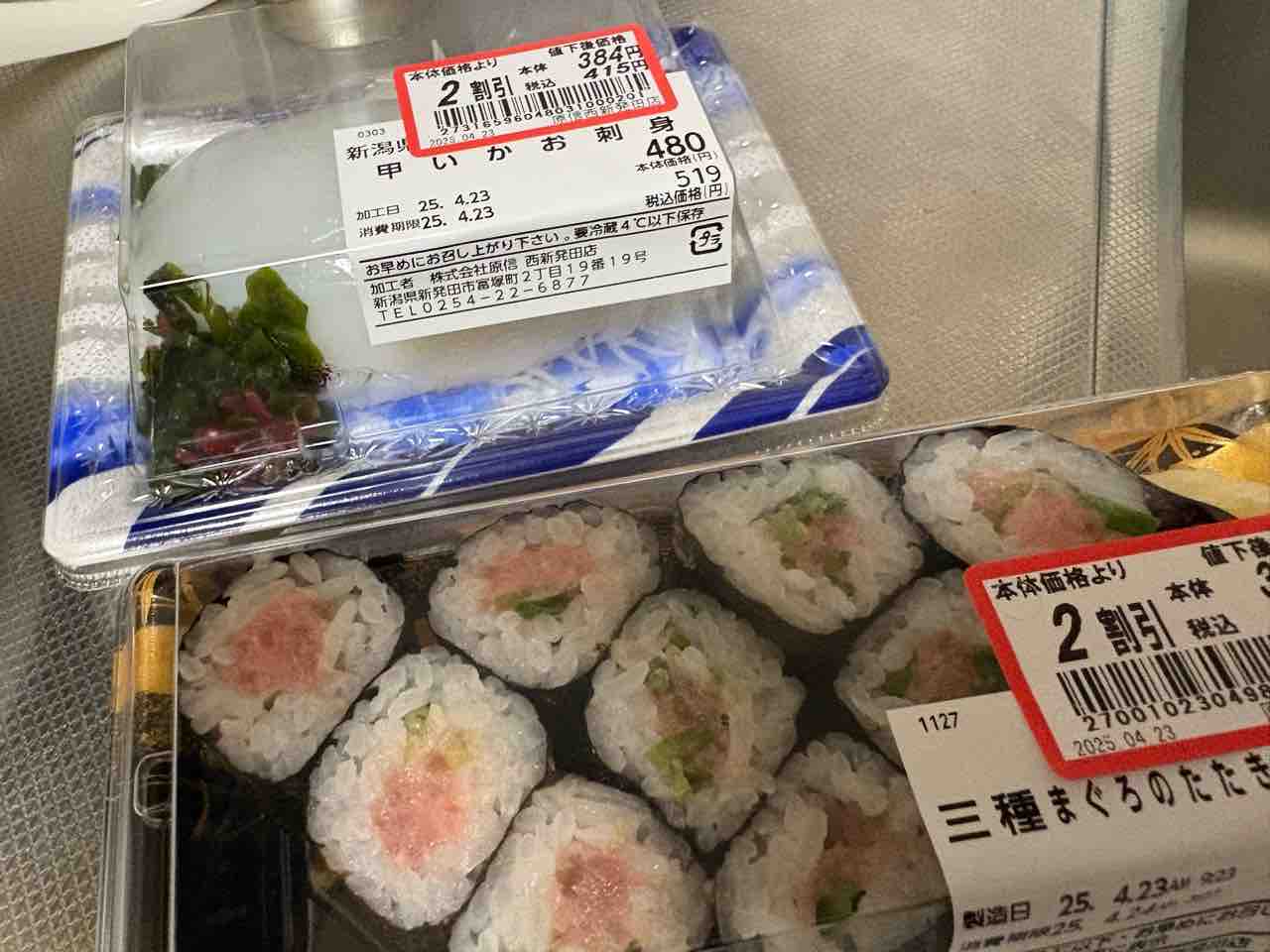 晩ごはんは新潟県産甲イカの刺身にネギトロ巻き