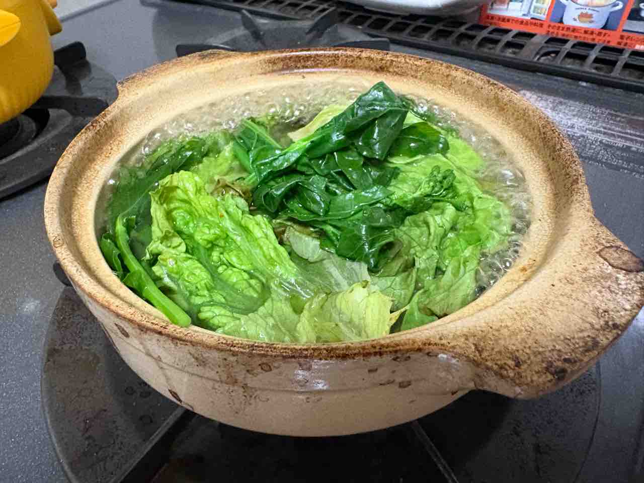 シャワー浴びて晩ごはんの続きでカップ麺スープレタス鍋