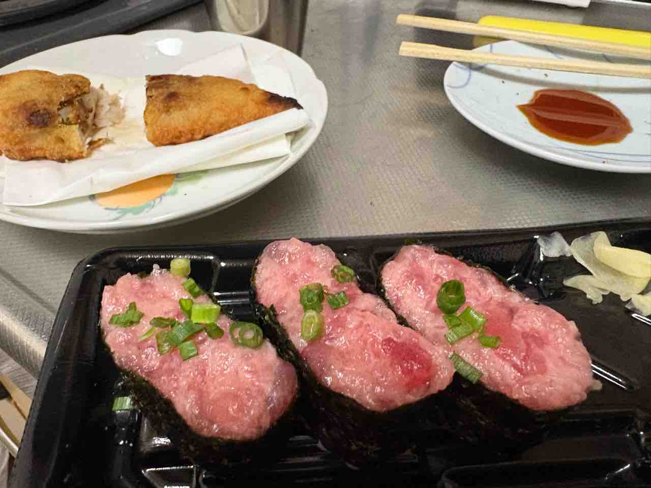 シャワー浴びて二度目の朝食はネギトロ軍艦の残りにセブンのささみ梅しそ揚げ