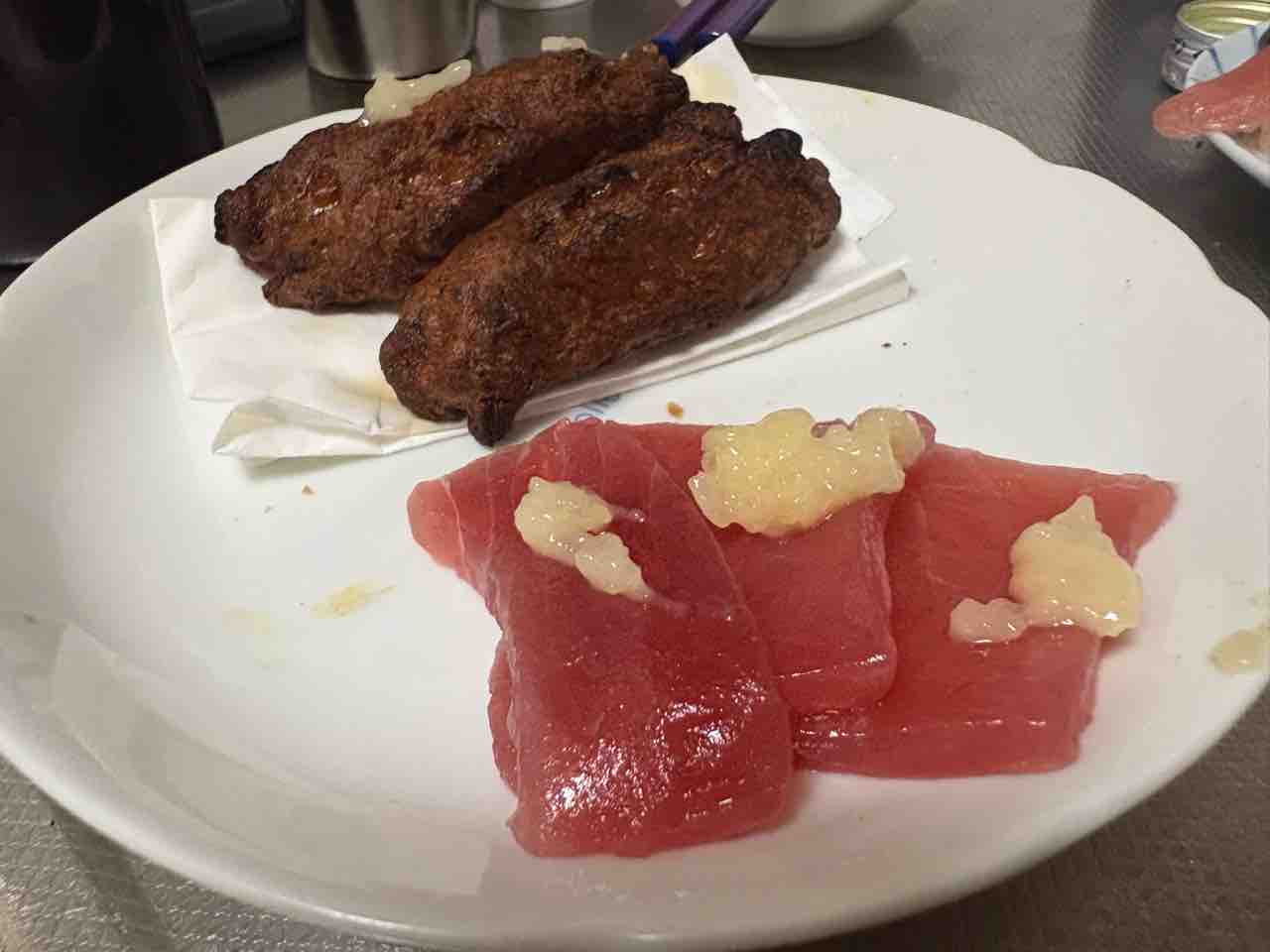 シャワー浴びて晩ごはんの続きはチキチキボーンにマグロ刺身