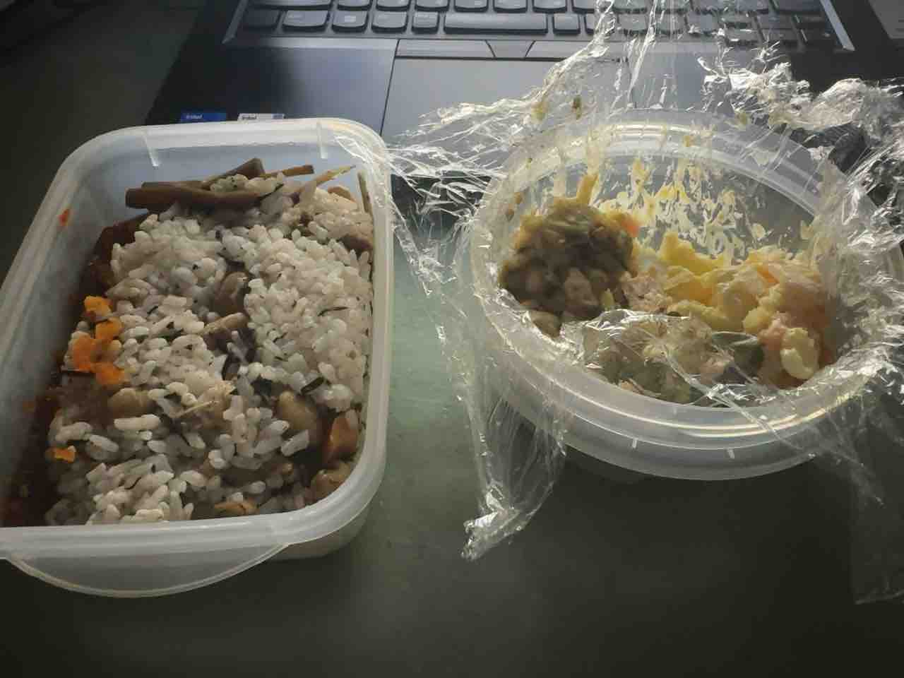 昼ご飯はレンチンひじきご飯に漬物と自家製ポテサラにコンビニ惣菜の残り