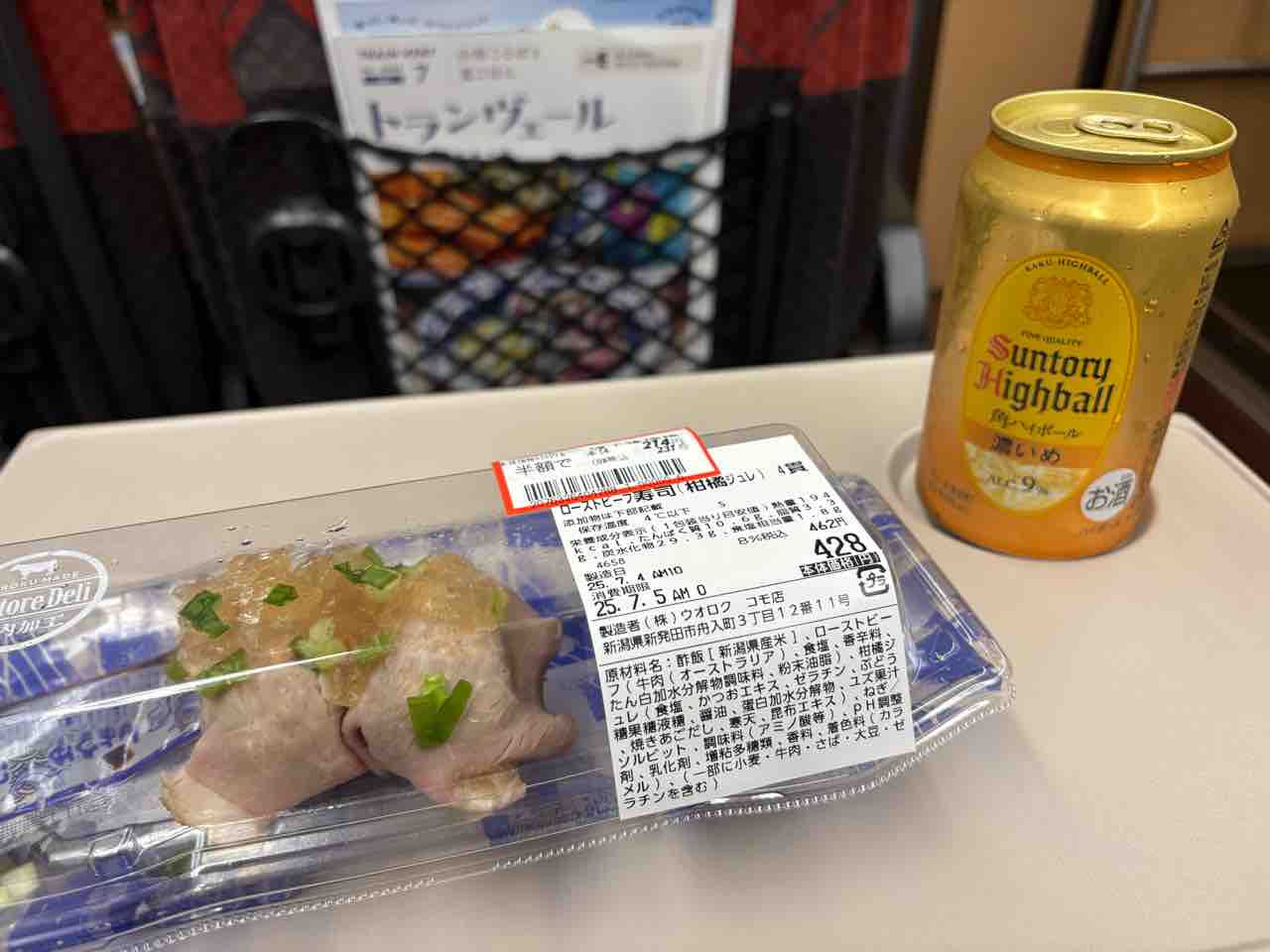 新潟着いて新幹線昨晩の残りローストビーフ握りでぷしゅ!