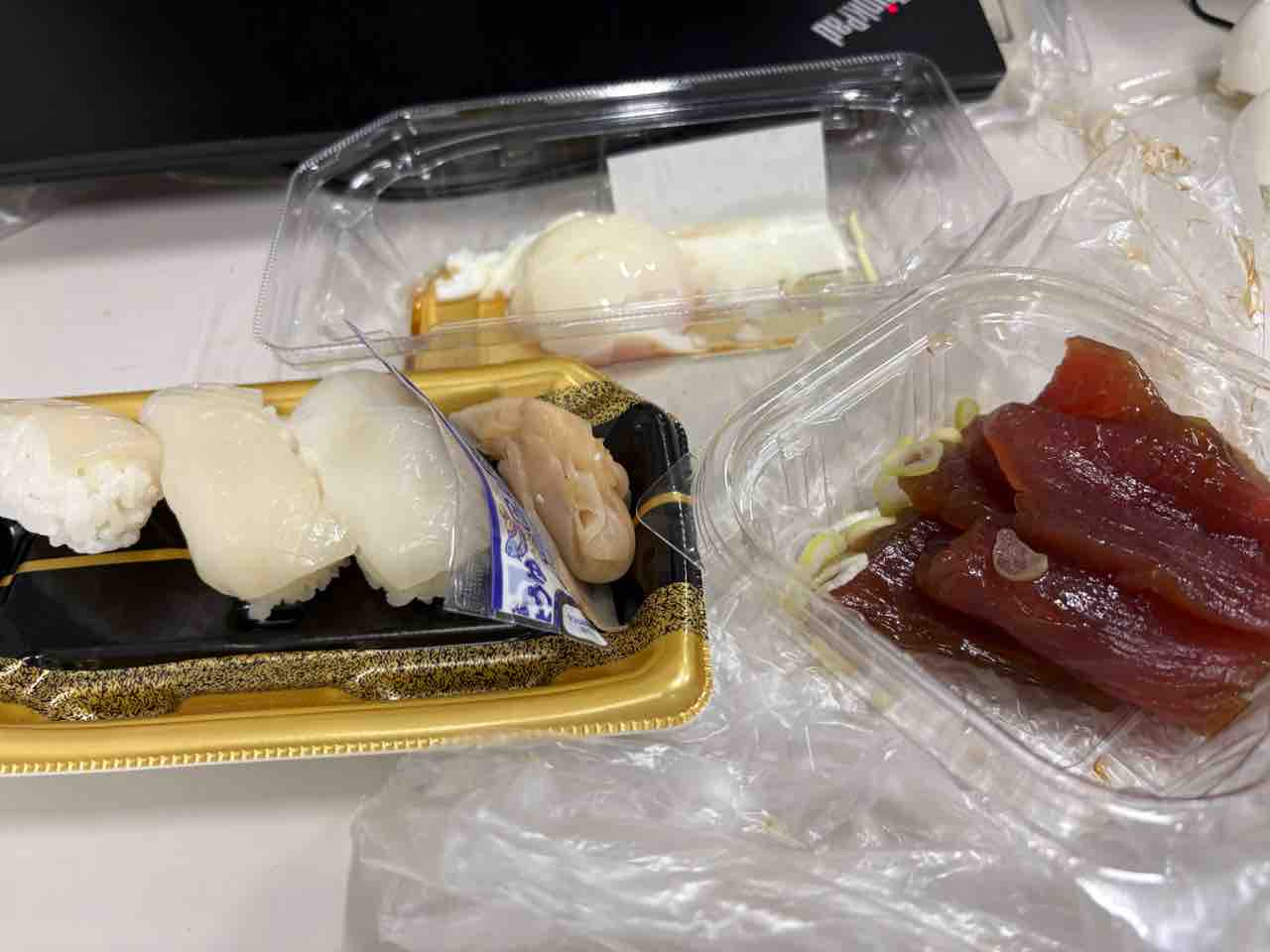 昼ご飯は昨日の残りのイカ握りにマグロの漬けと温玉