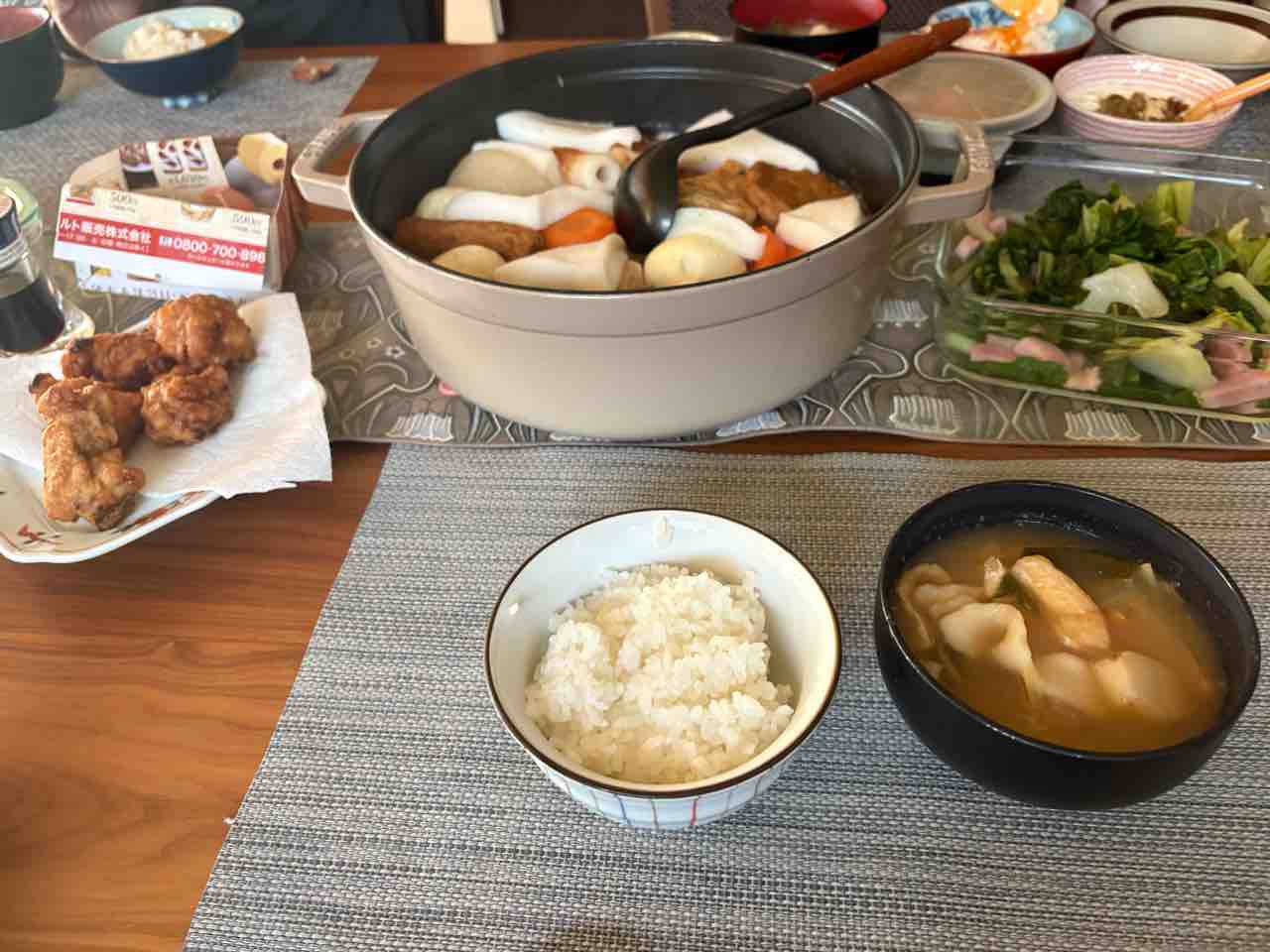 朝食はおでんの残りに昨晩駅ビルで買った唐揚げとかおっ切り込みの残りとか。