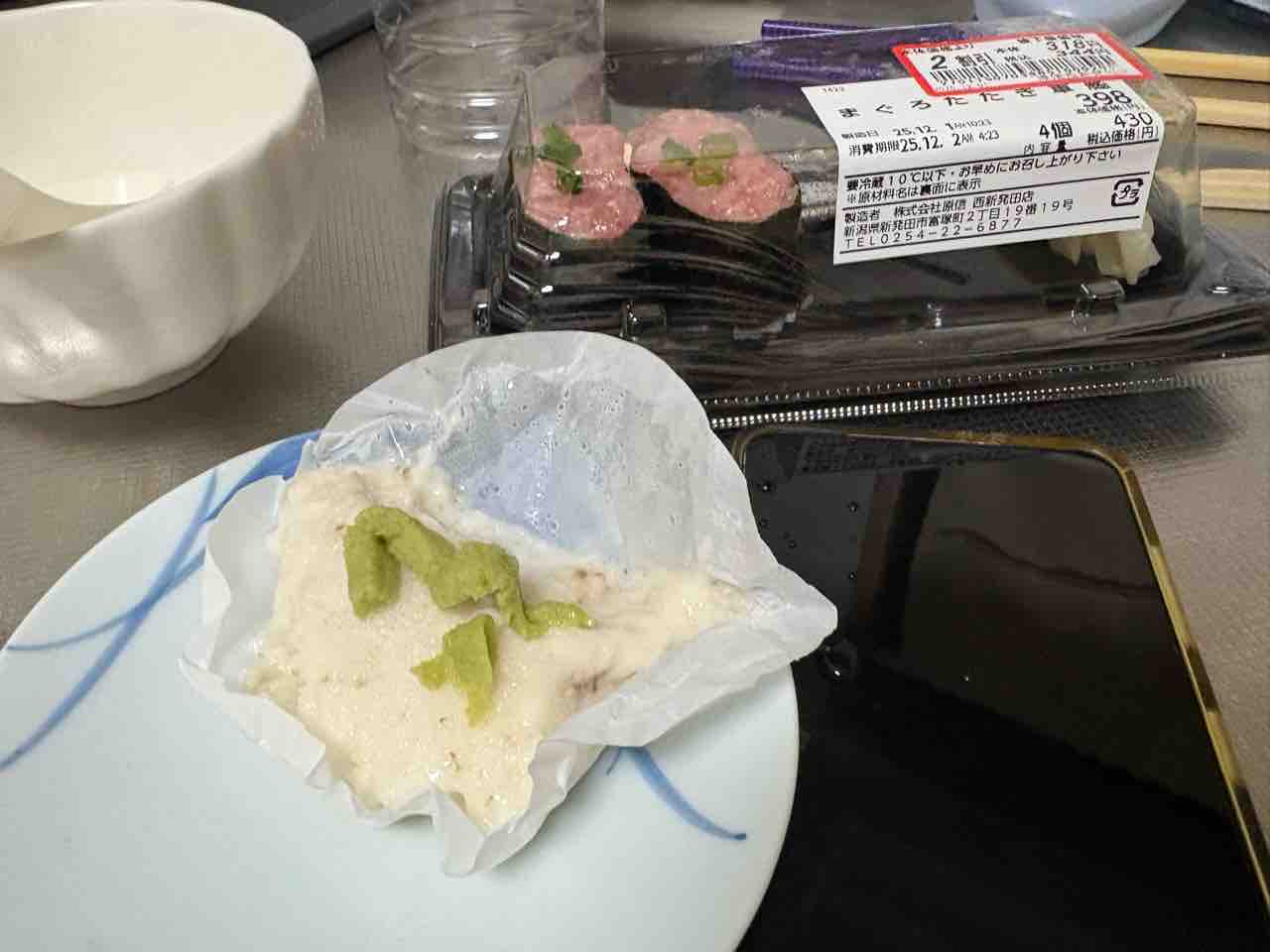 シャワー浴びて二度目の朝食はねぎとろ軍艦の残りに冷凍してあったトロロ芋