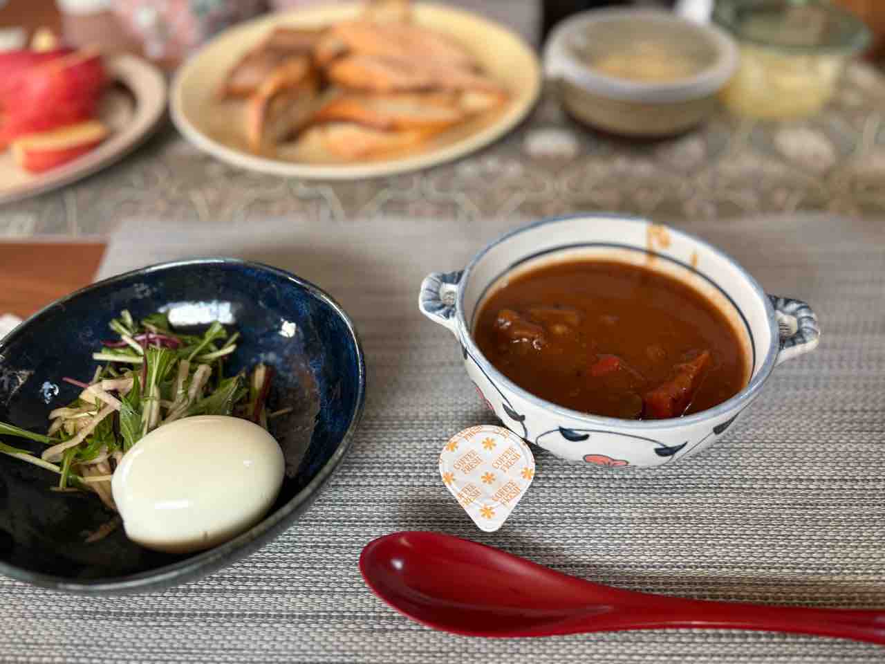 朝食はレトロドールのバゲットにサラダゆで卵ビーフシチュー。