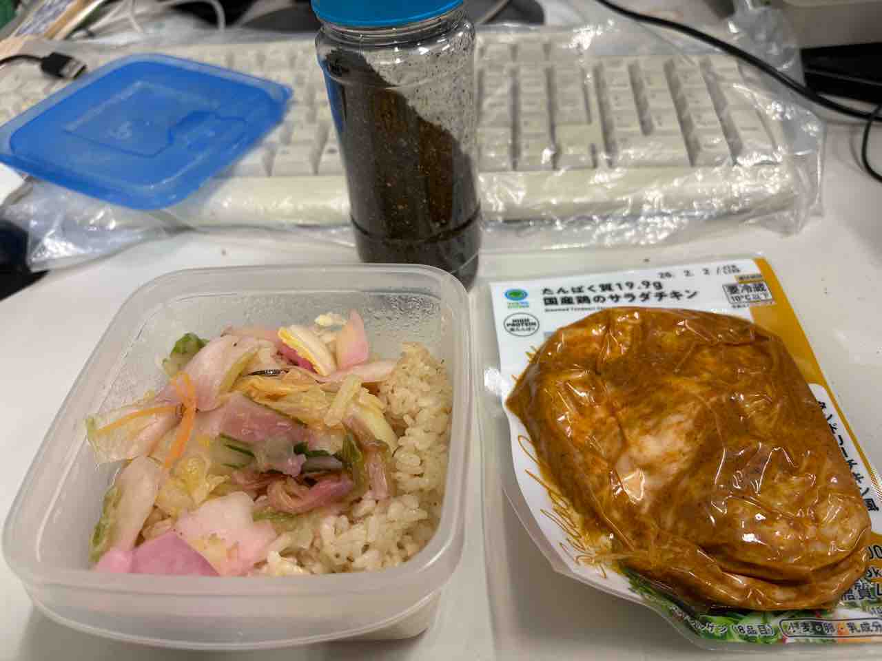 昼ご飯はレンチン玄米自家製ふりかけご飯に漬物と賞味期限切れサラダチキン