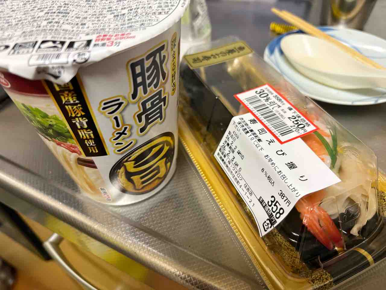 朝食はお決まりのカップ麺に寿司の残り。