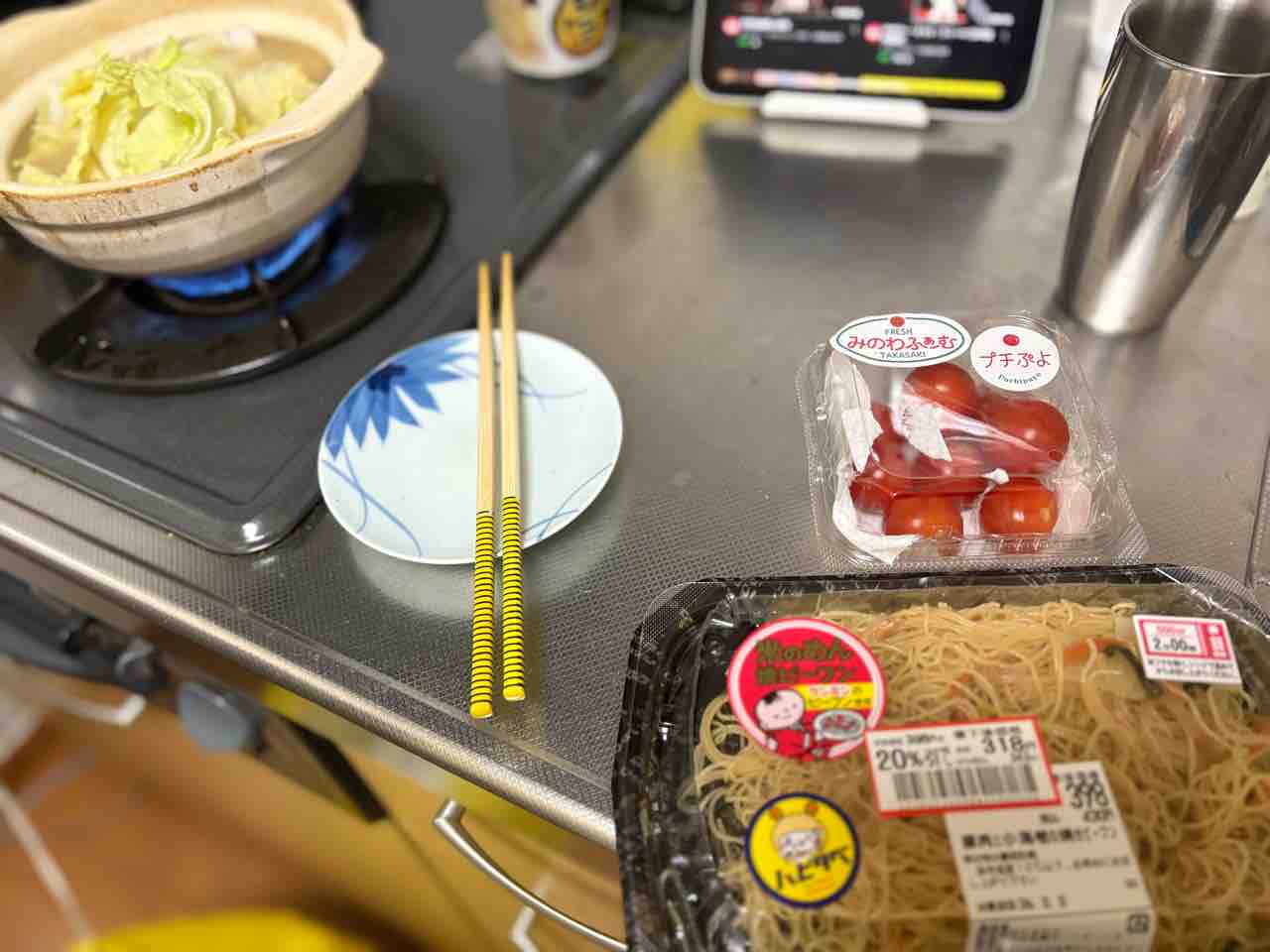 晩ご飯は昨日買ったビーフンと群馬から持ってきたミニトマトに