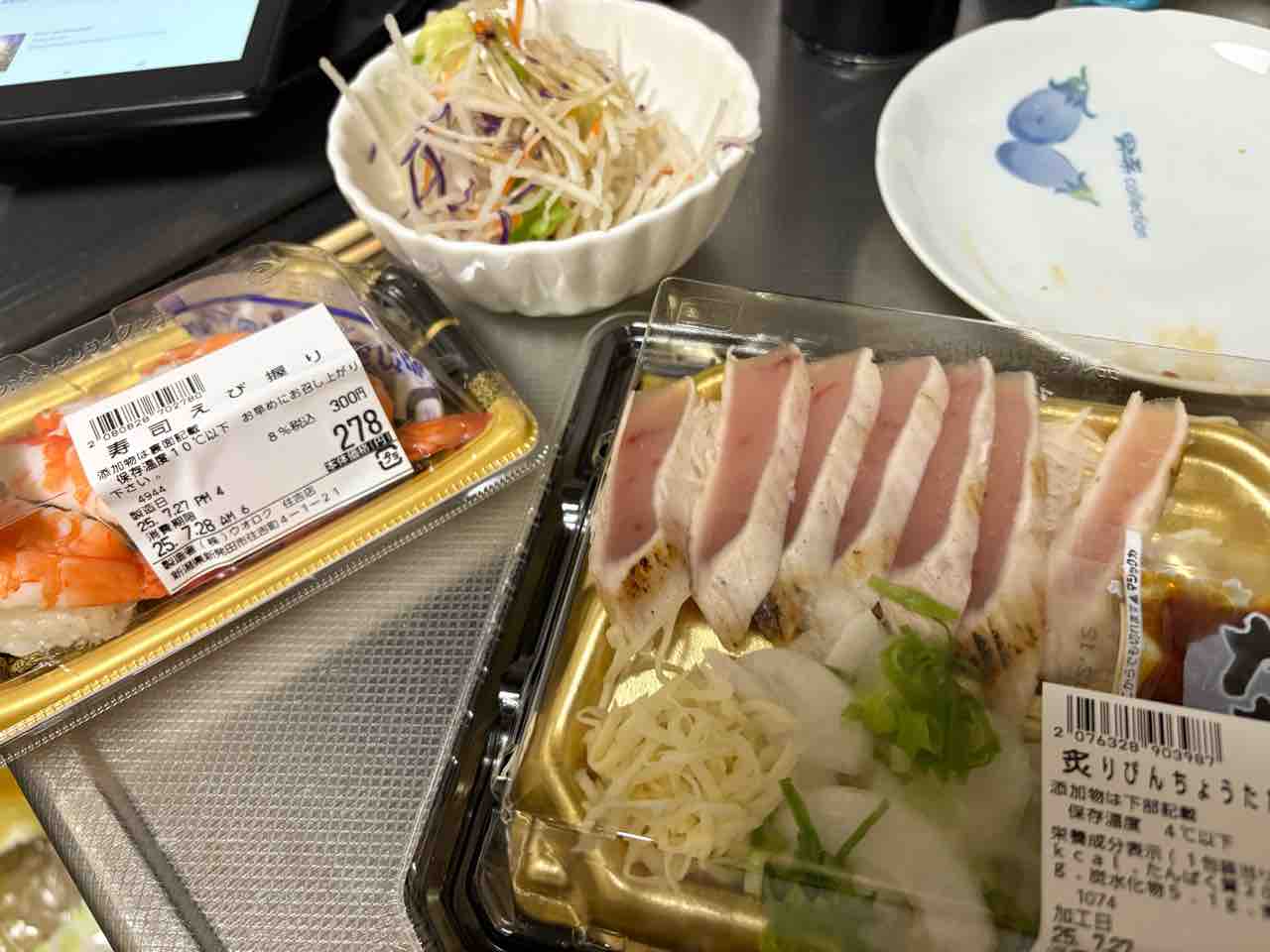 サラダに炙りビンチョウマグロのっけ盛り蒸しエビ寿司。